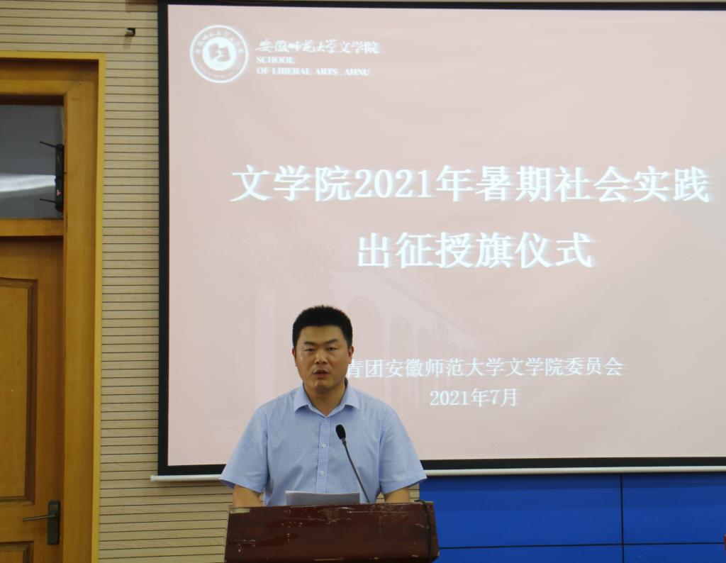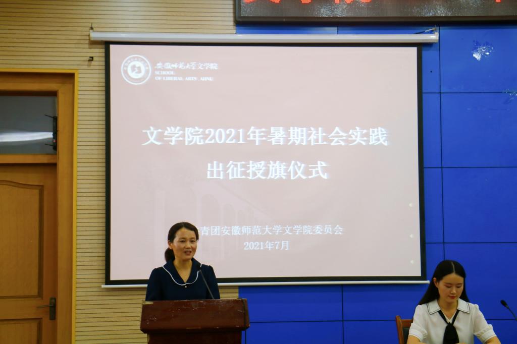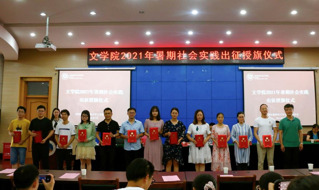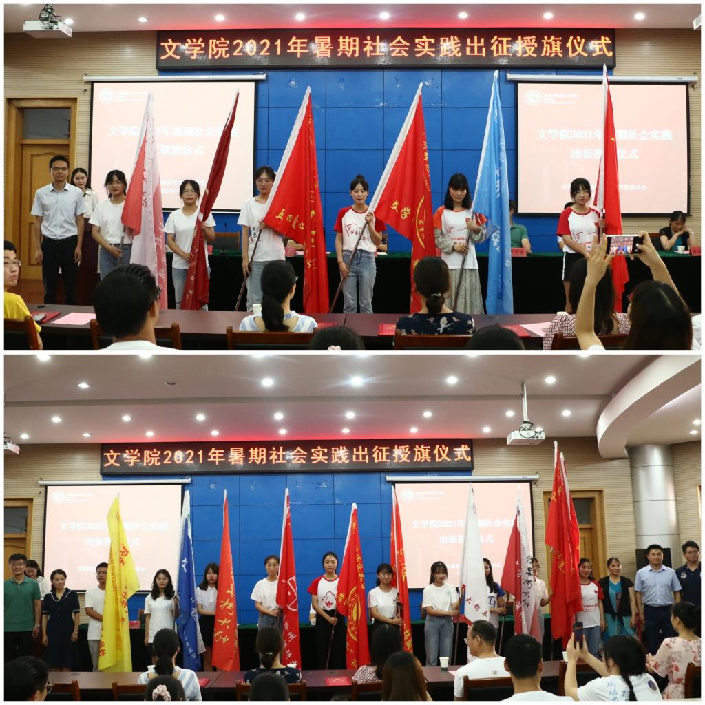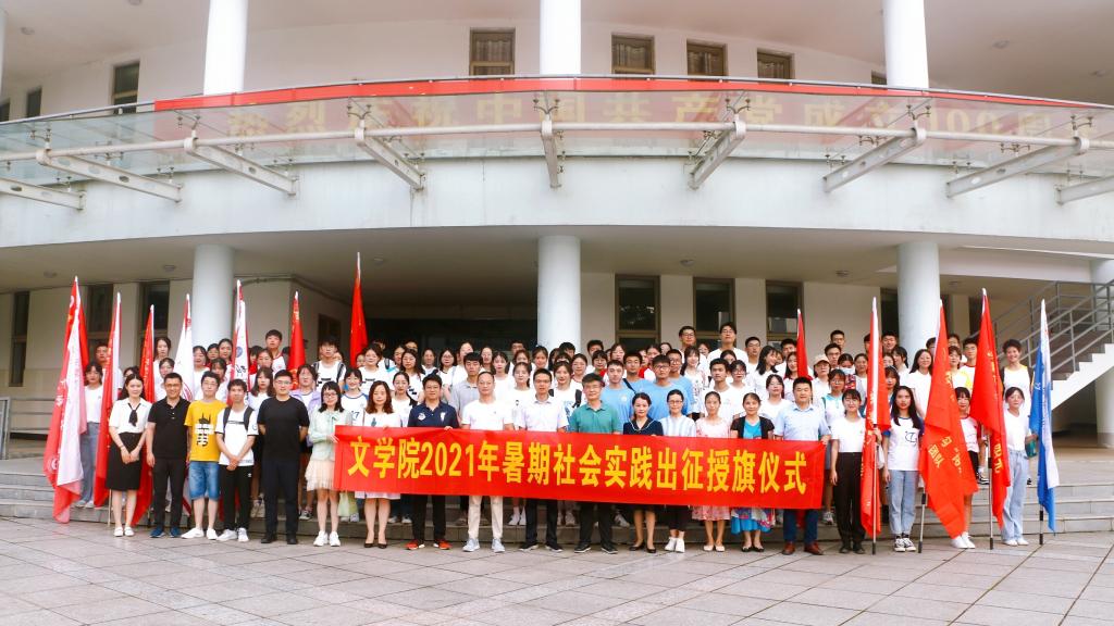 汪凯向学院2021年大学生暑期“三下乡”社会实践6支校级重点团队授旗,与会领导老师为社会实践院级重点团队和一般团队代表授旗。出征仪式在校歌中落下帷幕。