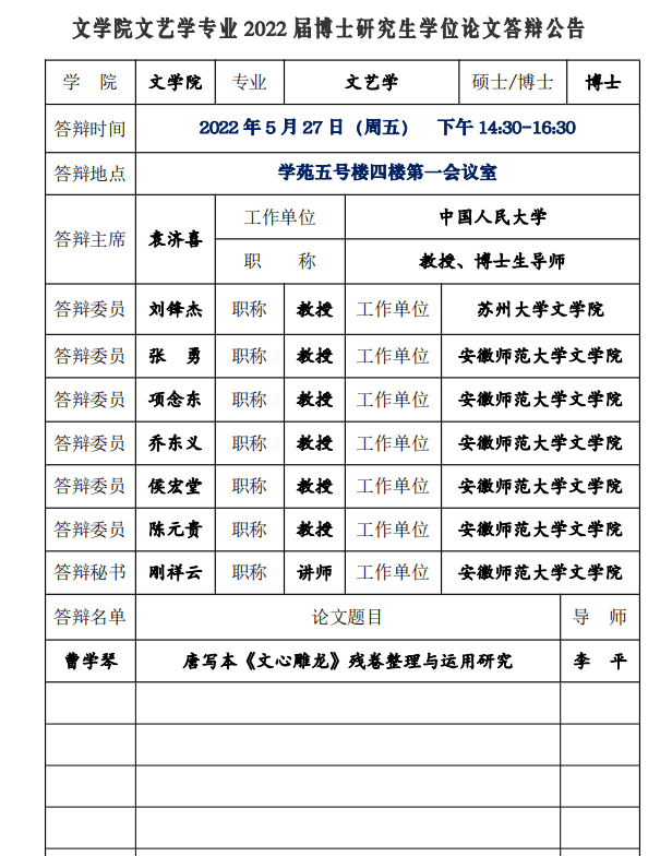 必赢线路检测3003no1文艺学专业2022届博士研究生学位论文答辩公告