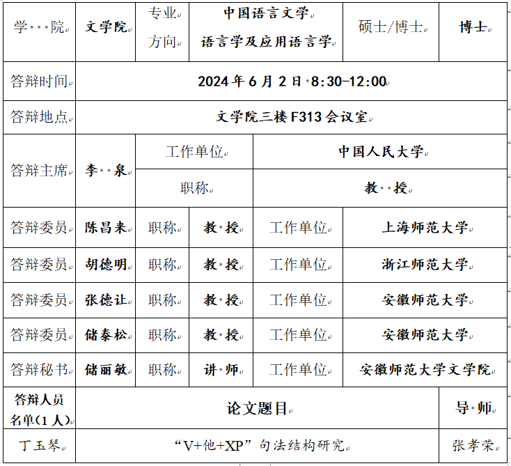 语言学及应用语言学专业2024届博士研究生学位论文答辩公告