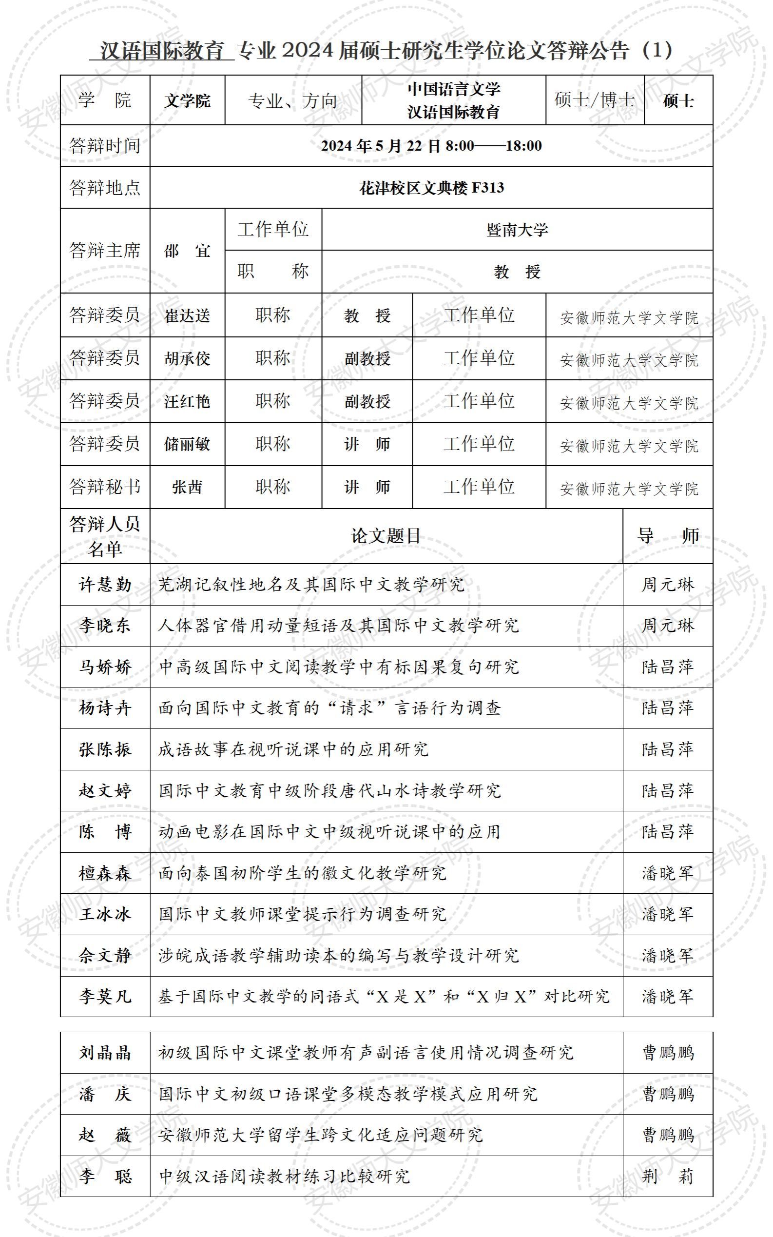 汉语国际教育 专业2024届硕士研究生学位论文答辩公告(1)