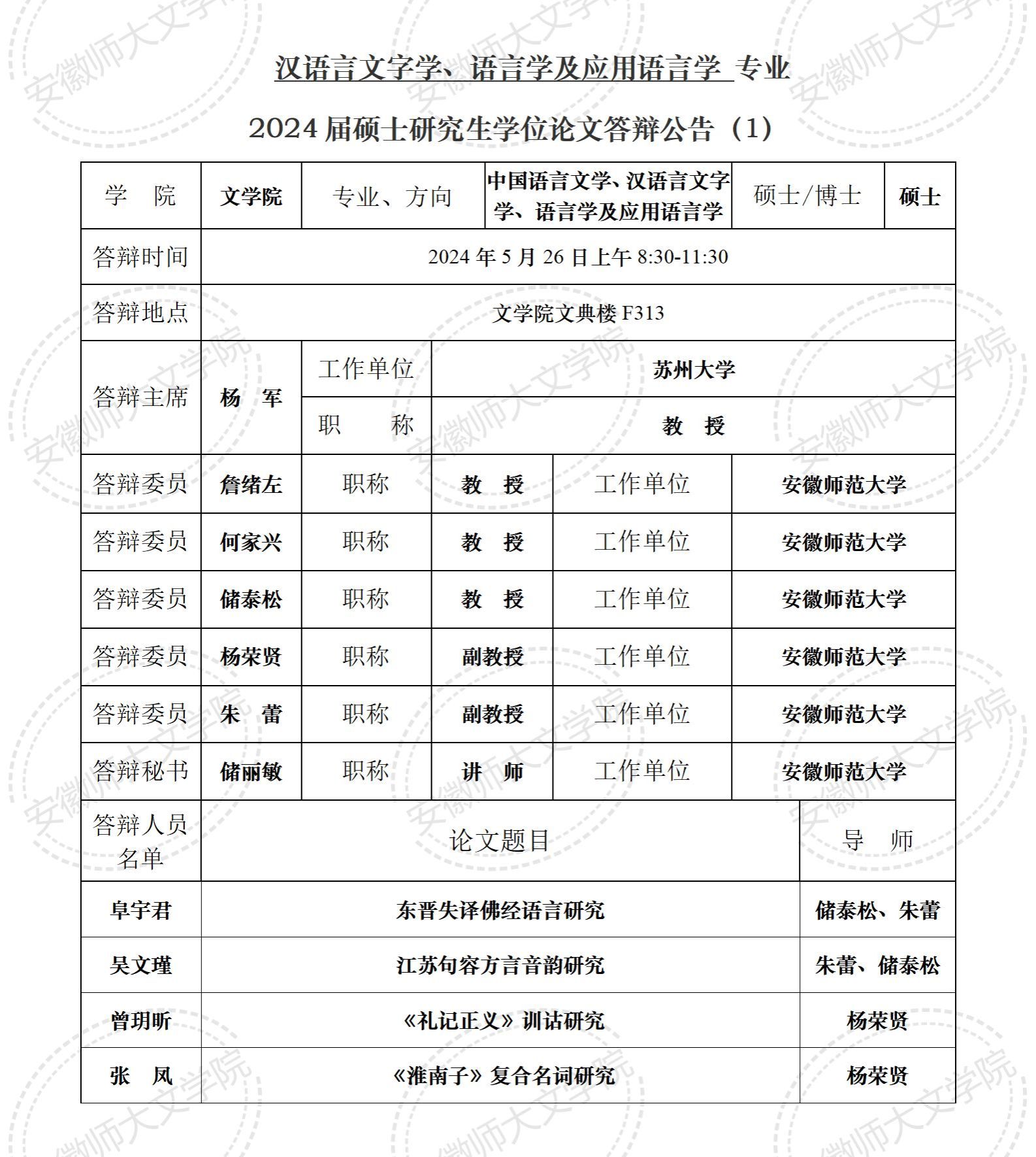 汉语言文字学、语言学及应用语言学专业2024届硕士研究生学位论文答辩公告(1)