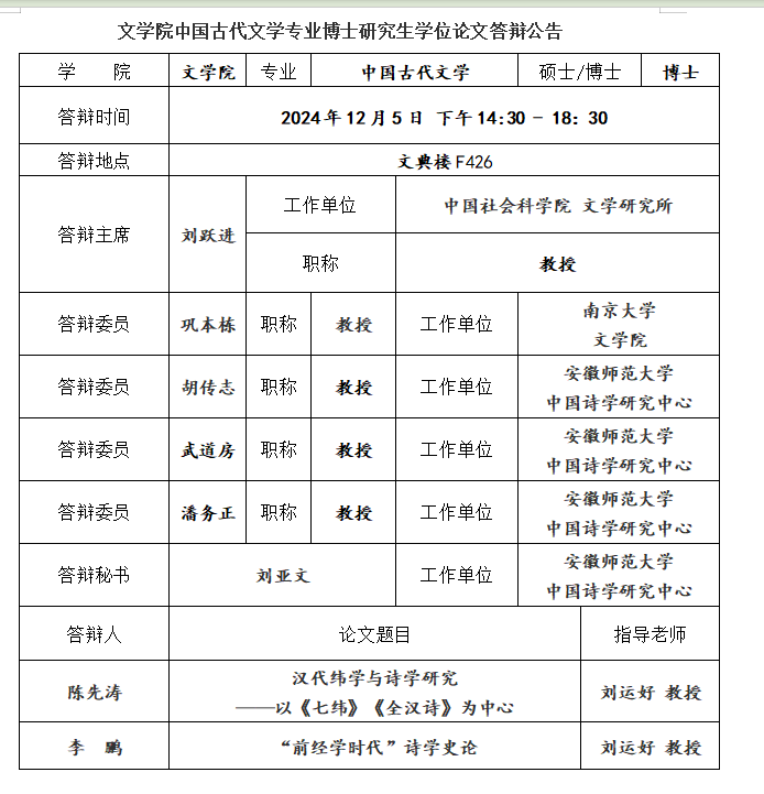 必赢线路检测3003no1中国古代文学专业博士研究生学位论文答辩公告