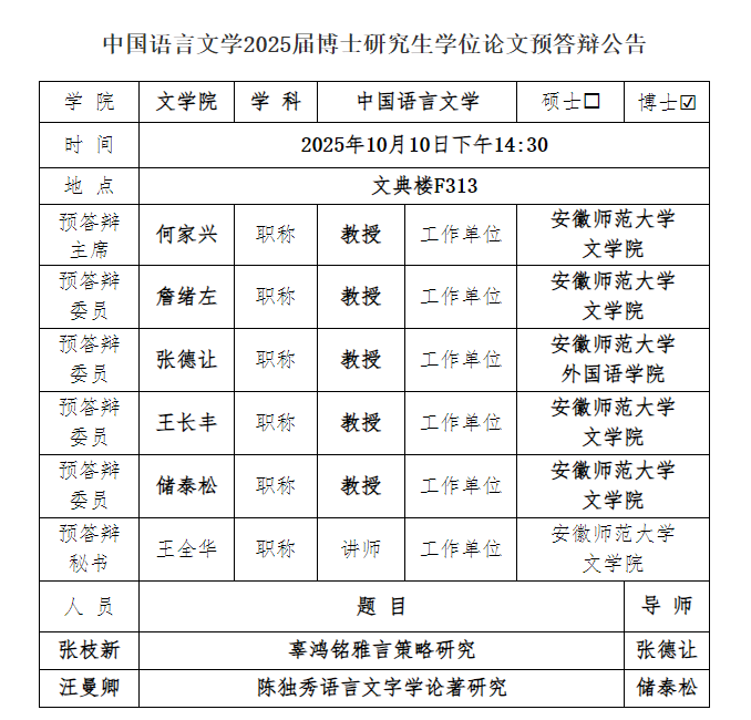 中国语言文学2025届博士研究生学位论文预答辩公告