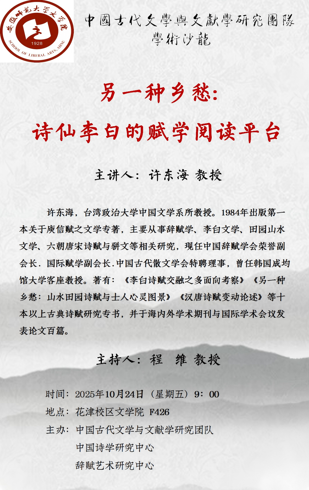中国古代文学与文献学研究团队学术讲座“另一种乡愁:诗仙李白的赋学阅读平台”预告