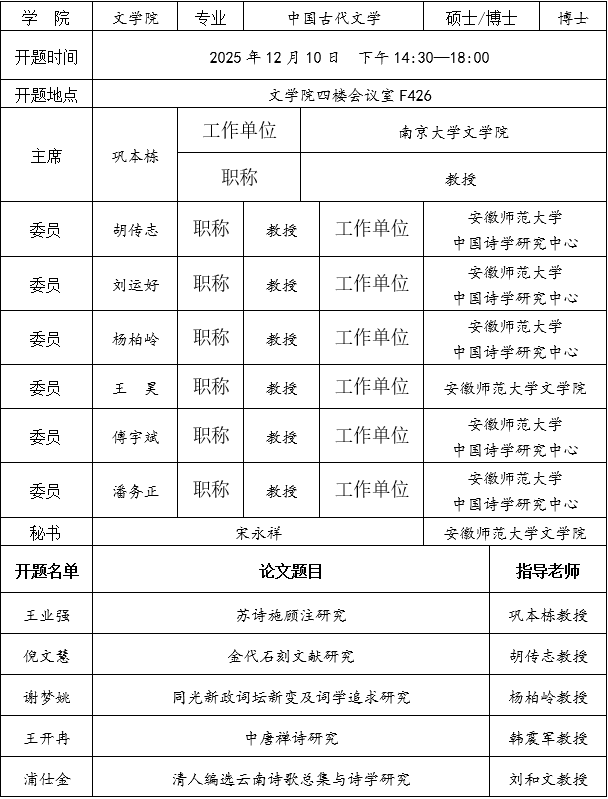必赢线路检测3003no1中国古代文学专业2024级博士研究生学位论文开题公告