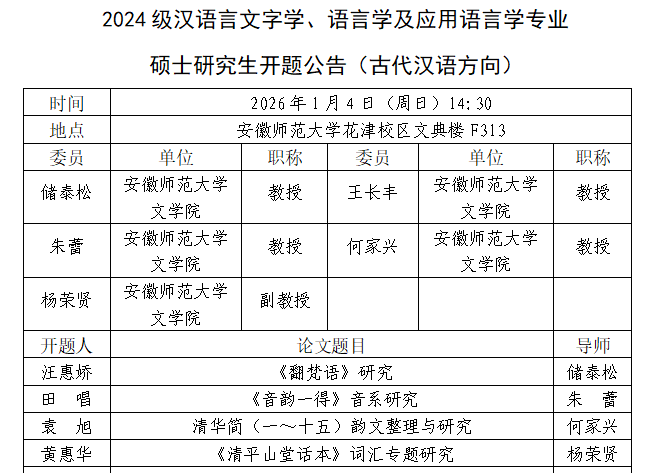 2024级汉语言文字学、语言学及应用语言学专业硕士研究生开题公告(古代汉语方向)