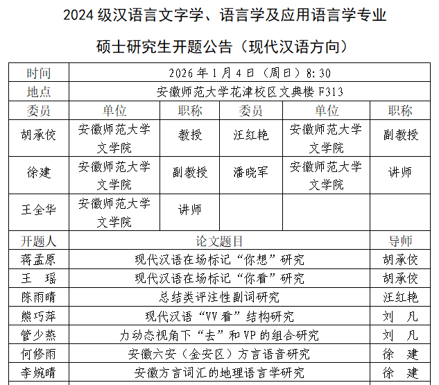 2024级汉语言文字学、语言学及应用语言学专业硕士研究生开题公告(现代汉语方向)