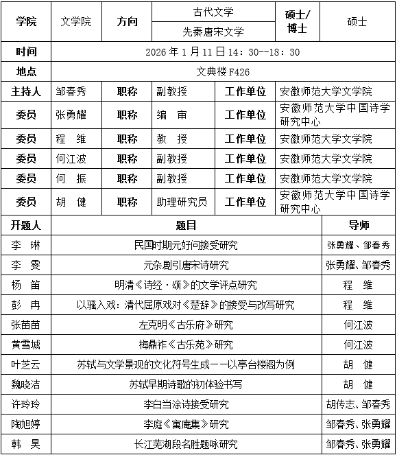 中国古代文学先秦唐宋文学方向2024级硕士研究生开题公告