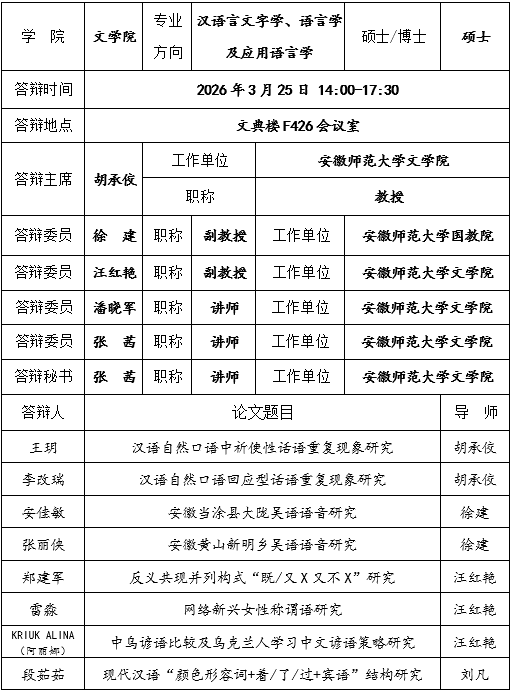 汉语言文字学、语言学及应用语言学专业现代汉语方向 2026届硕士研究生学位论文预答辩公告