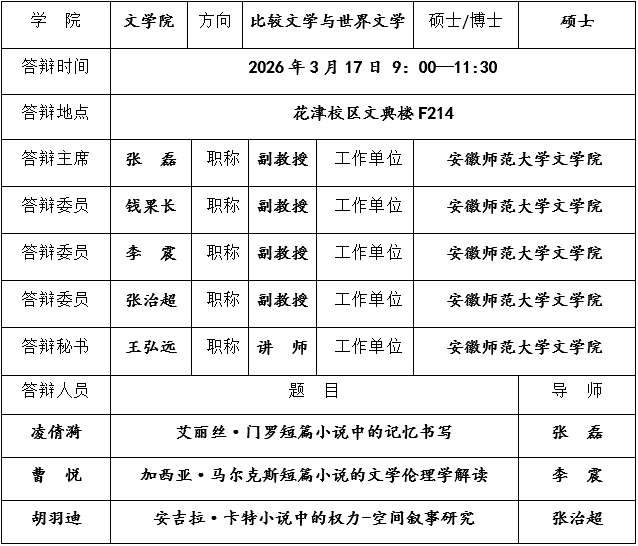 比较文学与世界文学专业2026届硕士研究生学位论文预答辩公告