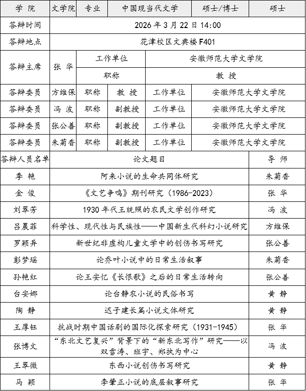 中国现当代文学专业2026届硕士研究生学位论文预答辩公告