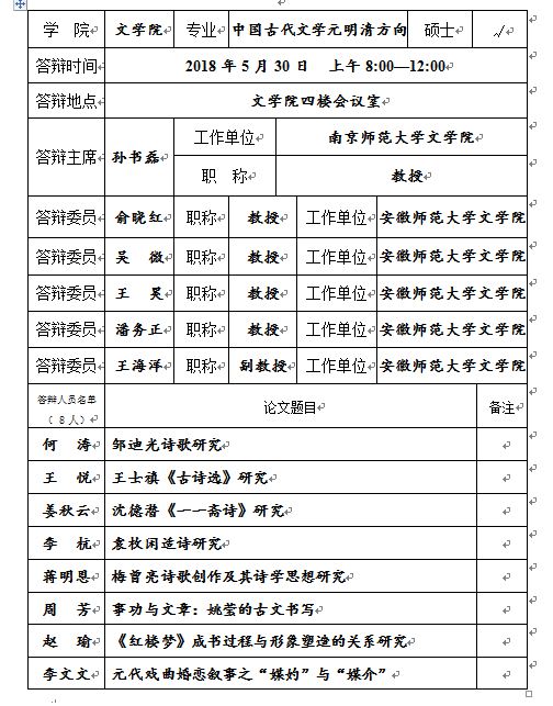必赢线路检测3003no1中国古代文学元明清方向2018届硕士研究生学位论文答辩公告
