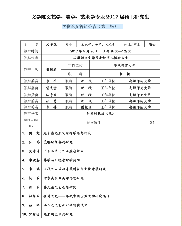 必赢线路检测3003no1文艺学、美学、艺术学专业2017届 学位论文答辩公告(第一场)