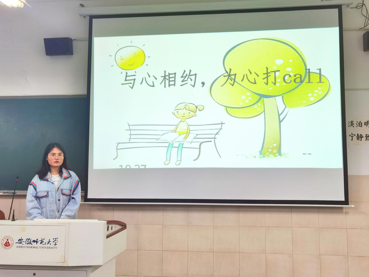 邀你爱我,共守阳光。10月27日,20级汉语言文学二班举办主题为“与心相约,为心打call”的心理班会。活动伊始,心理委员李雪千一以问题“大家知道世界心理健康日是几月几日吗?”作为导入点引入主题“10.25心理健康日”,再以哲理故事“对着大山喊话的孩子”为例子阐述积极生活的重要意义。接着,同学们对“如何正确排解情绪?”这个问题展开了激烈的讨论,将班会活动推向高潮,再由心理委员李雪千一进行点评和总结。最后,在大学生心理健康短视频《心旅》悠扬的结束曲中,“与心相约,为心打call”的主题班会圆满结束。