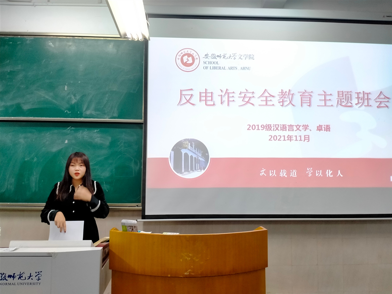 当前,电信网络诈骗犯罪活动猖獗,众多高校学生深受其害。为帮助同学们及时了解电信网络诈骗常见手段,提高同学们防范电信网络诈骗的意识,保护同学们的财产安全,净化高校学习环境。2019级汉语言文学专业于11月11日在行知楼2020103教室召开“反电诈安全教育”主题班会,本次活动由辅导员唐宇晴老师主持,19级汉语言文学专业全体同学参与。