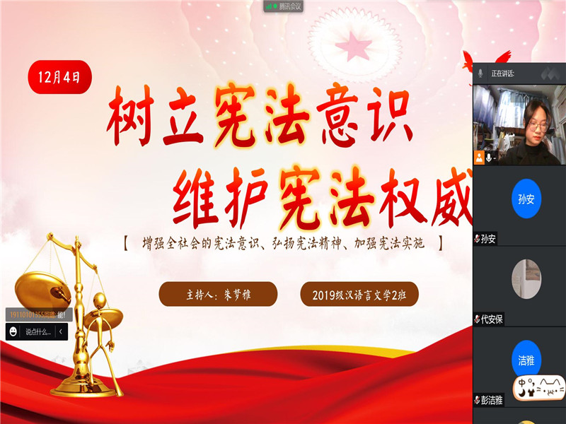 12月4日是国家宪法日,为进一步提高全体学生的法律意识,普及法律知识,弘扬宪法精神,推动校园法制文化建设,2021年12月3日,2019级汉语言文学2班通过线上会议的方式开展了有关宪法知识宣传的主题会议,本次线上会议由班级团支书朱梦雅同学主持,2019级汉语言文学2班全体学生参加。