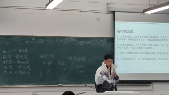 本次经验交流会,陈思敏学姐重点分享了自身备考教资和考研的经验,同时结合自身获奖的经历,向同学们解释了大学生职业规划设计大赛的内容和形式,鼓励大家积极参与、锻炼综合能力;杜岳龙学长作为第一批通过“硕师计划”保研的学生,向大家详细介绍了这项政策,并鼓励大家要始终认真、努力地学习,不负大学时光。