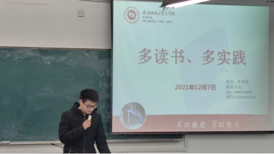 为了帮助同学们明晰大学规划,早准备早行动,12月7日晚辅导员杨玉婷老师主持召开“青春宣讲,榜样力量”青春分享会,邀请21级研究生陈思敏、18汉师专业保研学生张金和杜岳龙进行主讲。