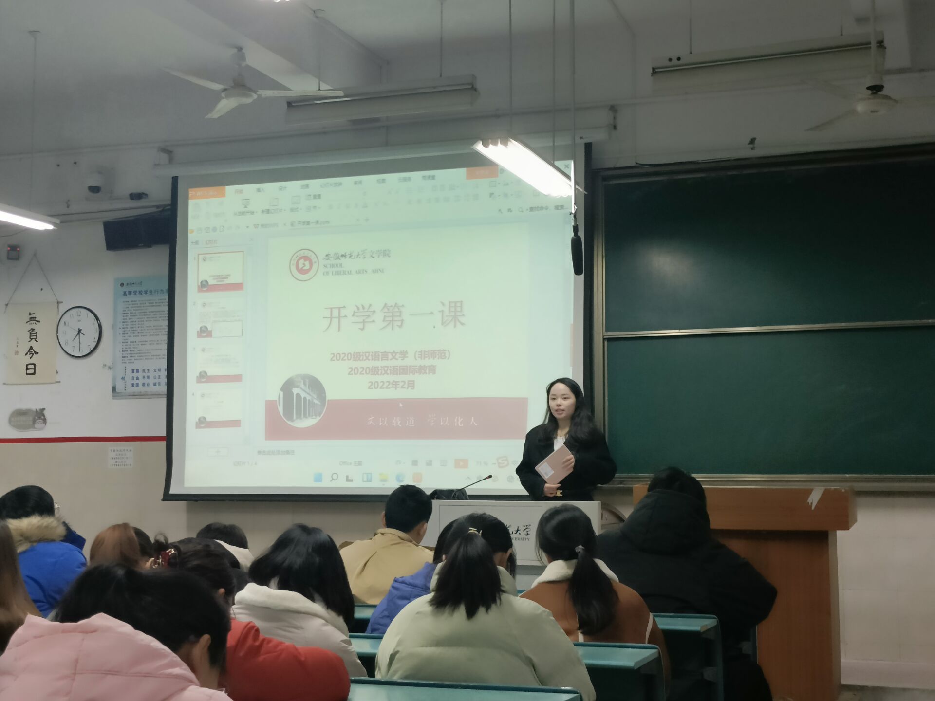 律回春晖渐,万象始更新。新学期伊始,为积极贯彻落实2022年春季学期教育教学和新冠肺炎疫情防控等工作,开展好思想政治教育,2月20日晚19:00,20级汉语国际教育与20级汉语言文学(非师范)全体同学共同参加了“开学第一课”主题班会活动,班会由辅导员茆蕾老师主持。