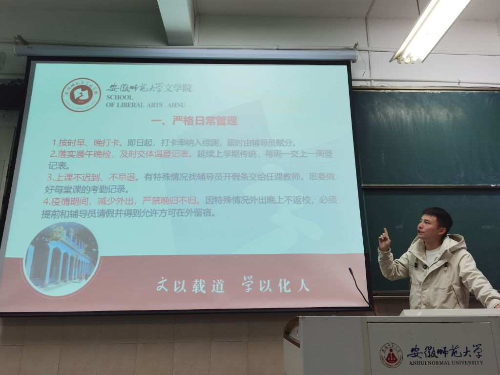 首先是班级日常管理工作。需要全体同学做到早晚按时打卡,并落实晨午晚检、及时上交体温表及疫情期间,减少外出,严禁晚归不归。只有做好日常管理工作,才能使其他班级事务高效、合理地进行,日常管理是学生安全和校园稳定的重要保证,是加强班级建设的重要举措。其次是宿舍、责任教室安全卫生工作的安排。宿舍需每天保持干净整洁并强调禁止在宿舍内使用违规电器;责任教室需每天安排值日生负责教室卫生。最后是对疫情防控、疫苗接种、防范网络电信诈骗、基础文明素养等问题的提醒。