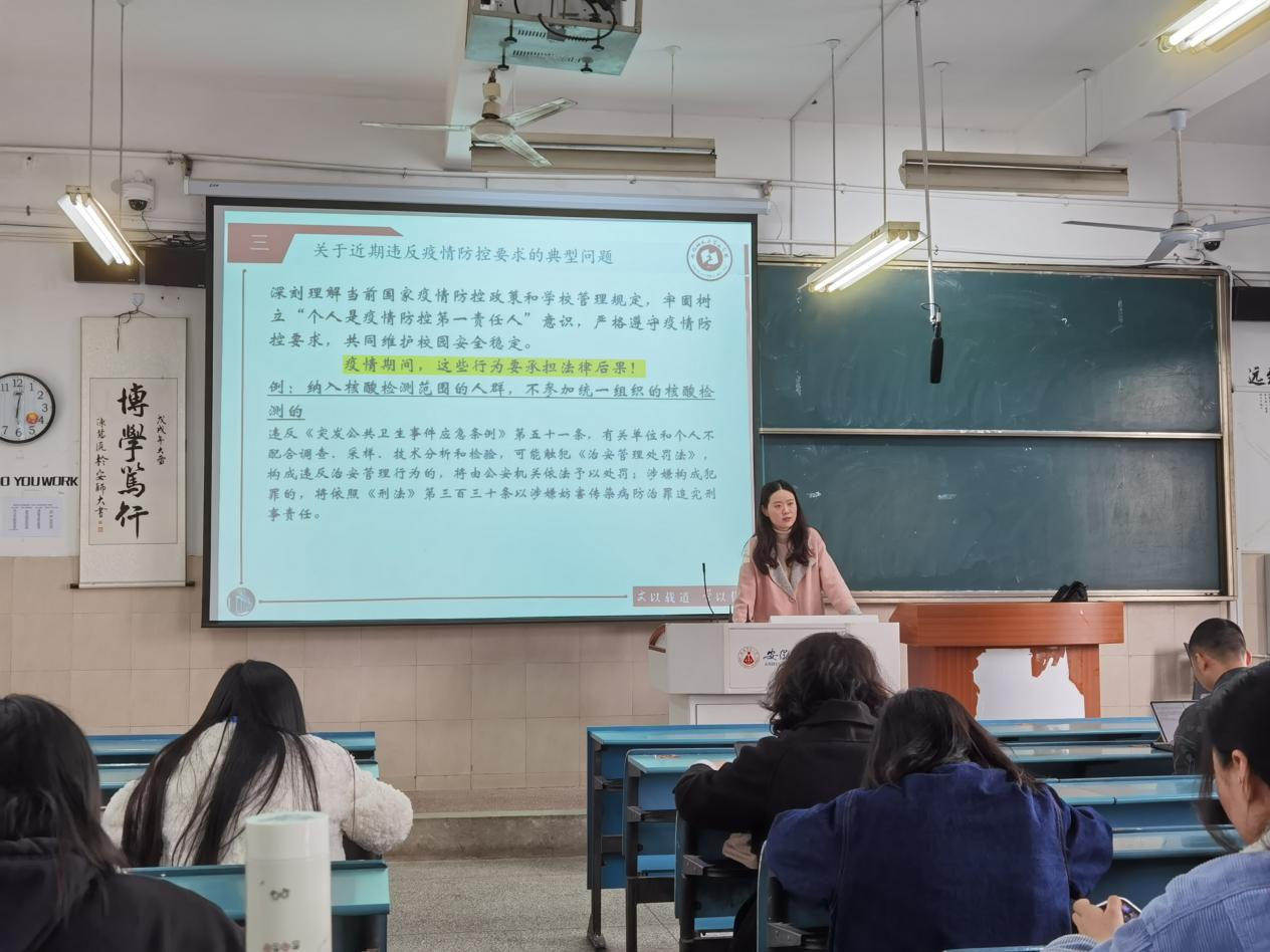 了解违规典型,牢记防疫要求。为使同学们更加细致地了解疫情防控的要求,杨老师讲述了近期出现的一些违规典型问题,如虚构请假事由、篡改个人行程码,在调查时提供虚假证明材料,未经许可带校外人员进校和晚点名代打卡等。通过一桩桩典型案例,同学们深刻理解了当前国家疫情防控政策和学校管理规定的必要性,牢固树立了“个人是疫情防控第一责任人”的意识,并将严格遵守疫情防控要求,共同维护校园安全稳定。
