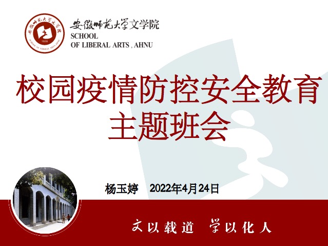 杨玉婷老师定期在线上提醒同学们注意疫情防控,加强个人防护,要求同学们自觉遵守防疫的各项规定和要求,不信谣,不传谣。同时召开线上主题班会,强调“疫情防控,解封不解防”,树牢自己是疫情防控第一责任人意识,坚决不违反“四项禁令”,倡导同学们尽量不堂食,打包带回宿舍用餐,自觉做到不点外卖。做好自我健康监测,如出现不适立即与辅导员联系。并向同学们告知了五一放假安排,作息时间调整等注意事项。并鼓励同学们参加近期开展的丰富多彩的团学活动,例如首届大学生讲思政课比赛、大学生创新创业大赛、话剧汇演、手抄报比赛等。