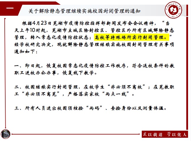 自4月17日芜湖市主城区开展静态管理以来,20级汉语言文学师范专业在辅导员杨玉婷老师和学生骨干的共同努力下有序推进静态管理期间学生教育管理工作。