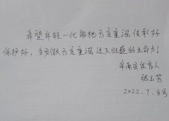 通过多方寻访,刘珂联系到阜南县文化局的于世化先生和阜南天棚农民文化公园的张玉芳女士。于老师表示,方言童谣保护总体上难度较大。他身边知道方言童谣的人已经不多,虽然县文明办等开展了优秀童谣的相关活动,但是目前方言童谣的现状依然不容乐观。作为阜阳方言童谣传唱人的张女士,出于对方言的热爱,她了解许多阜南县的方言童谣且都能传唱,并将其作为自己生活的一种乐趣。在谈到晚辈对方言童谣的了解程度时,她直言对方言童谣了解不多,但是很喜欢这些方言童谣,也能朗朗上口一部分。但有些方言用语年轻人也不知道是什么意思,比如“天黑了”用方言就类似于“天歇了”。她希望小时候父母唱给自己的方言童谣能够传承下去,让后辈们也能拥有丰富多彩的童年记忆。