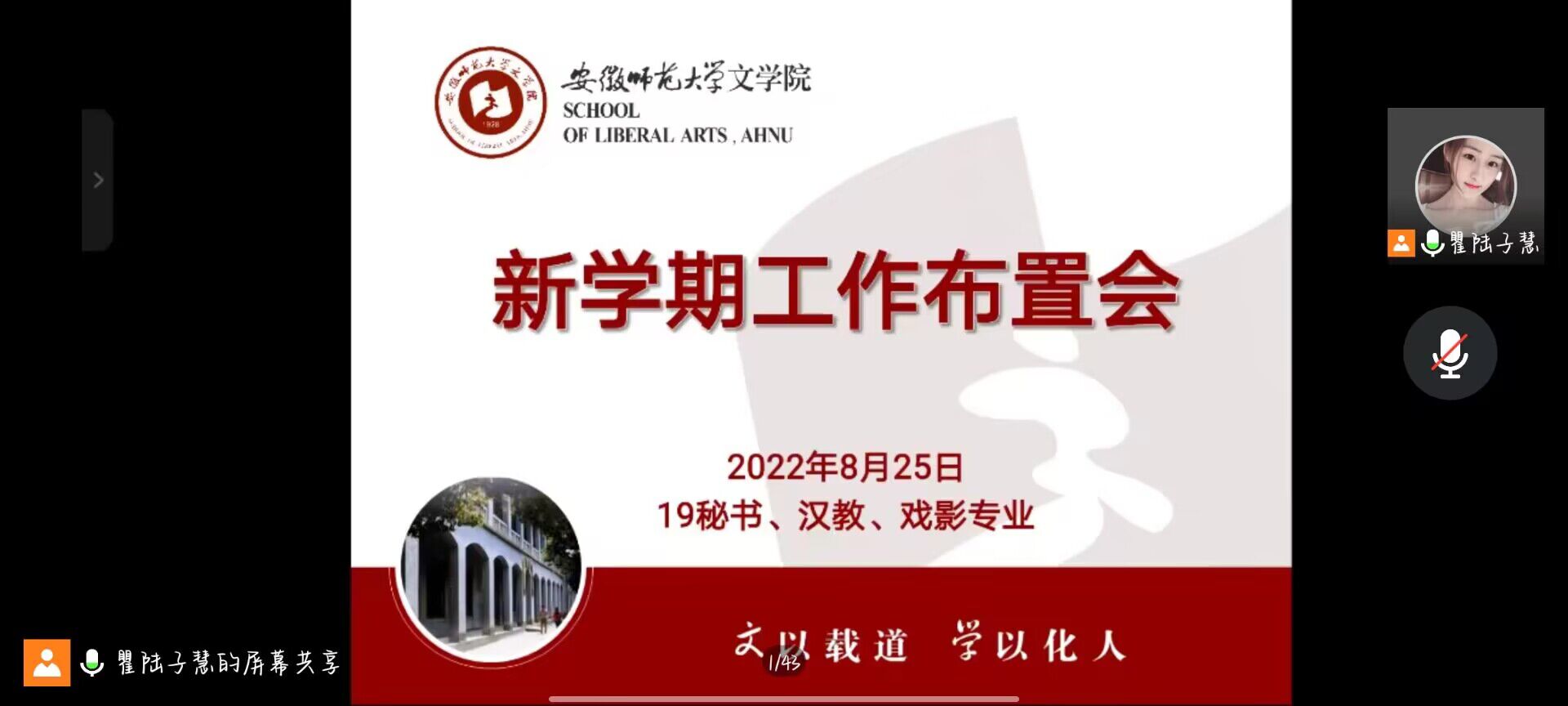 秋意绵绵,返校日近。为妥善布置班级秋季返校工作,帮助学生解读综合测评、推免工作注意事项,8月25日晚,2019级汉语国际教育、秘书学、戏剧与影视文学专业全体同学通过腾讯会议平台召开线上班会,线上班会由辅导员瞿陆子慧主持开展。