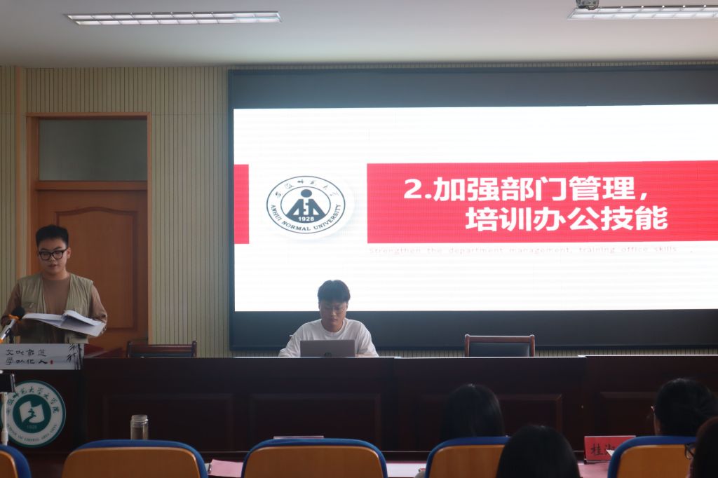 本次述职大会主要分为两个部分。首先是主席团和各部门负责人进行工作汇报。继往开来,方兴未艾。主席团成员周舟先是总结了过去一整个学期的工作,汇报了大家所取得的成绩,同时也重点提出工作作风、效率等问题,强调要加强思想引领,不断务实精进,建设“规范式,服务式,成长式”学生会。主席团成员鲁洪、徐方雯、汪颖等人也回顾了过去一年的活动,从“传承”、“担当”等方面号召大家在新学期要协作共进,继续为文院的学生工作做出贡献。
