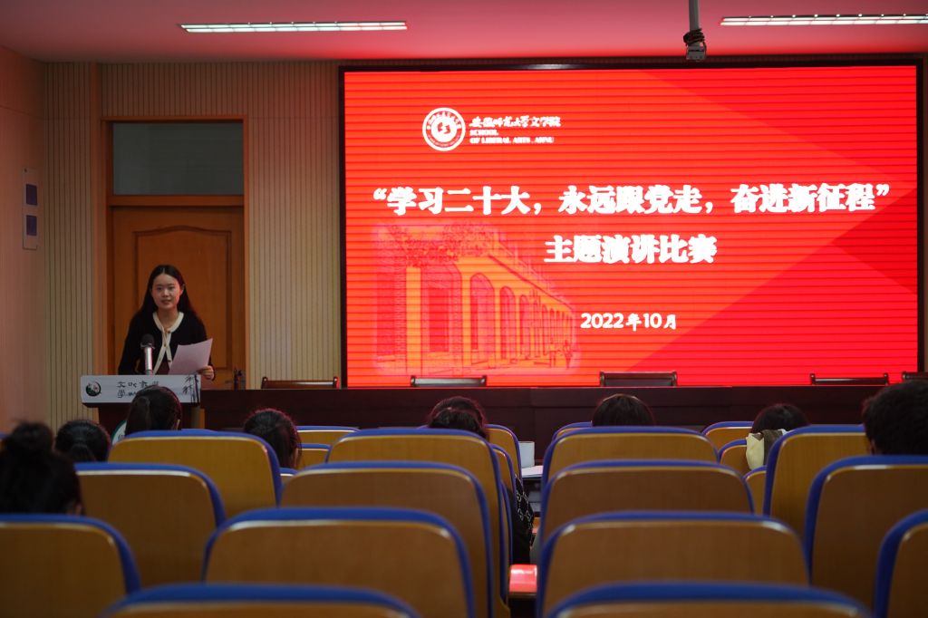 比赛过程中,选手们围绕“学习二十大”主题,采用ppt形式,声情并茂地表达了关于党史学习教育的感悟与成长。青春逢盛世,奋斗正当时,2020级汉语言文学非师范专业喻昕介绍了驻村干部黄文秀把生命献给脱贫攻坚事业的奋斗故事,将青年榜样的力量与学习党史教育相结合,寓教于行;初心涅槃,笃定前行,2021级汉语言文学师范专业张宇慧向大家分享了暑期参与抗疫志愿者活动的青春故事,亲身体验一线工作的艰辛,展现青年一代的自觉与担当。21级秘书学专业吴怡以宋书声为榜样,呼吁新时代青年勇毅前行,成为意气风发、坚韧不拔的时代新人;砥砺而行,向光而生,2202级中国语言文学专业徐玉玲提出了“有国才有糖,有糖才有国”的新颖看法,通过讲诉爷爷抗美援朝时的红色故事,宣扬对老一辈革命军人的尊重与敬仰。22级中国语言文学专业梁玉阳则带领大家回忆了无数中国共产党人投身革命、矢志报国的感人故事,号召青年学子饮水思源、不忘前恩。