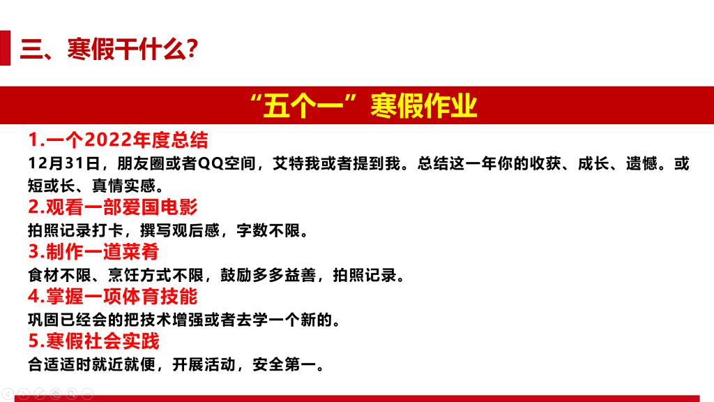 返乡后班会从疫情防护、心态调节、寒假生活等方面出发,冯文君在疫情初步放开的大背景下提醒学生注意自身健康防护之外格外强调了学生的寒假心态调整,希望同学们可以在保持乐观态度的基础上在学习上不懈怠,在生活上不懒惰。