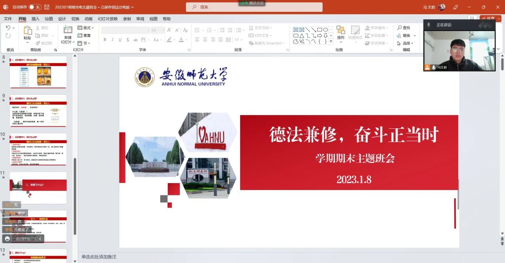 为确保学生安全过寒假,成长在寒假,切实筑起安全防线,护航返校开学。2022级汉语言文学专业分别于2023年1月8日、1月19日、2月7日在线上开展返乡后、假期中、返校前的教育主题班会。
