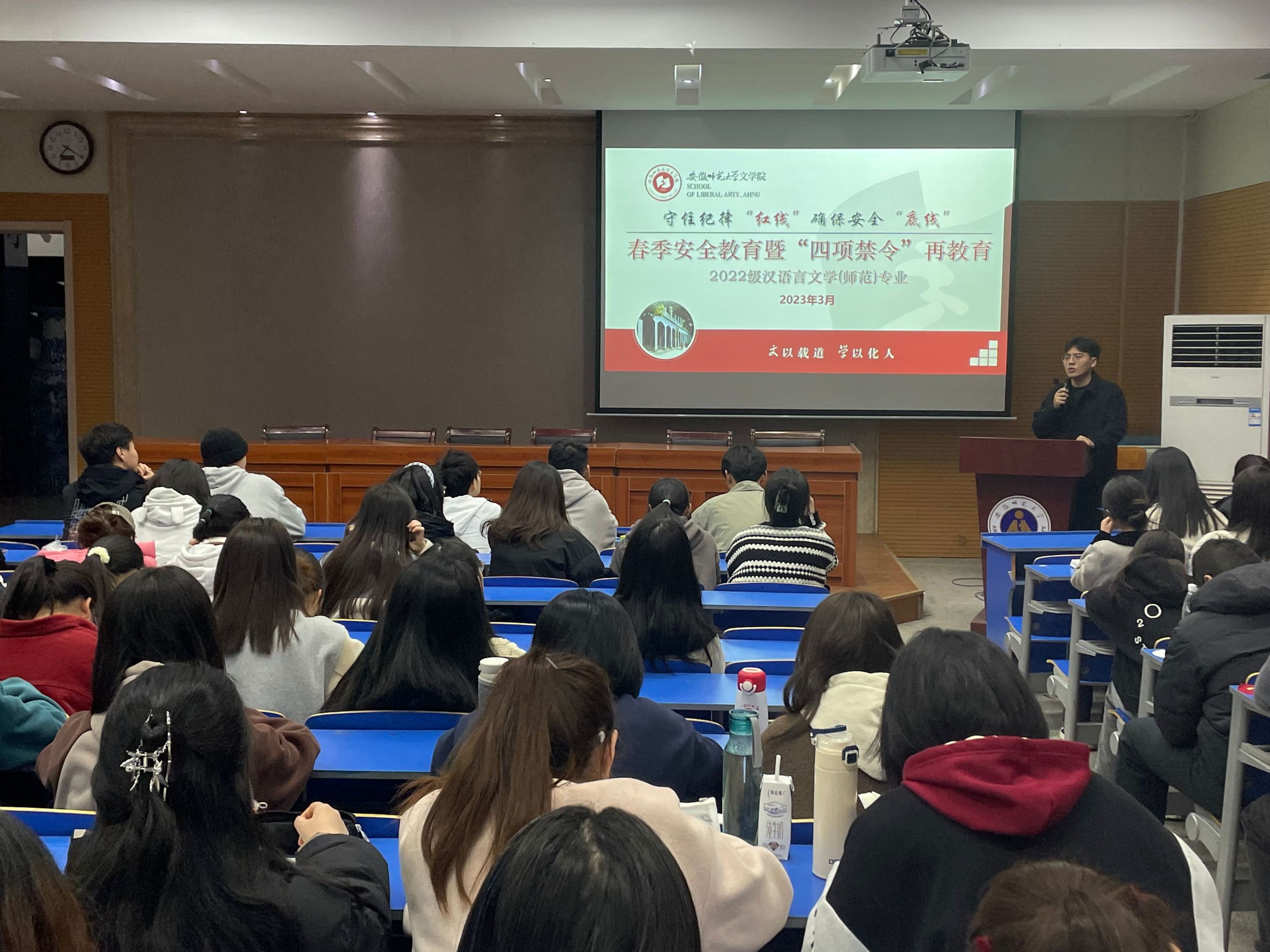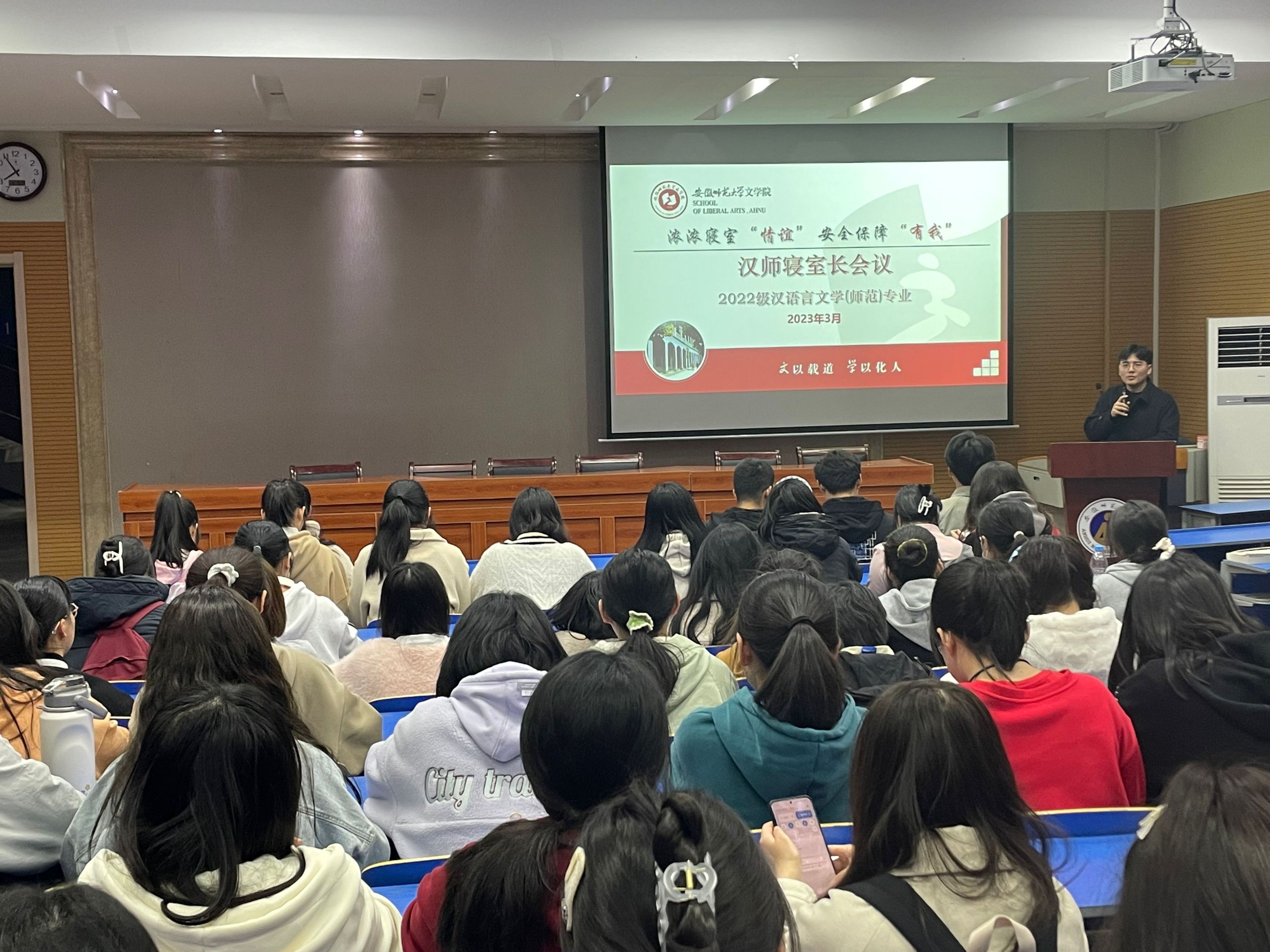 新学期伊始,为了进一步提高学生校园安全意识,引导寝室长加强责任意识,提高班委凝聚力,2023年3月5日,22汉师专业于天门山图书馆报告厅开展春季教育主题班会。本次主题班会汉语言文学专业全体学生共同参与,班会由辅导员冯文君主持。