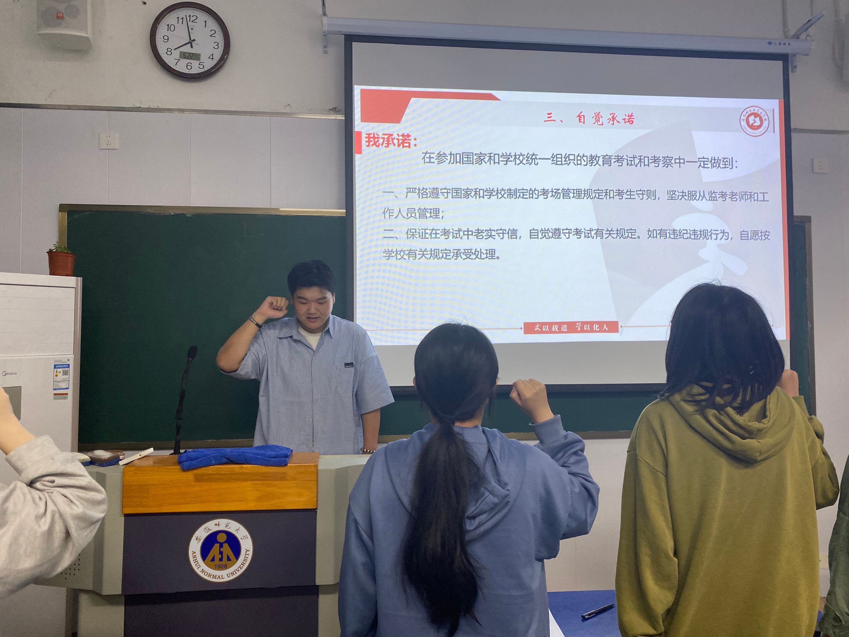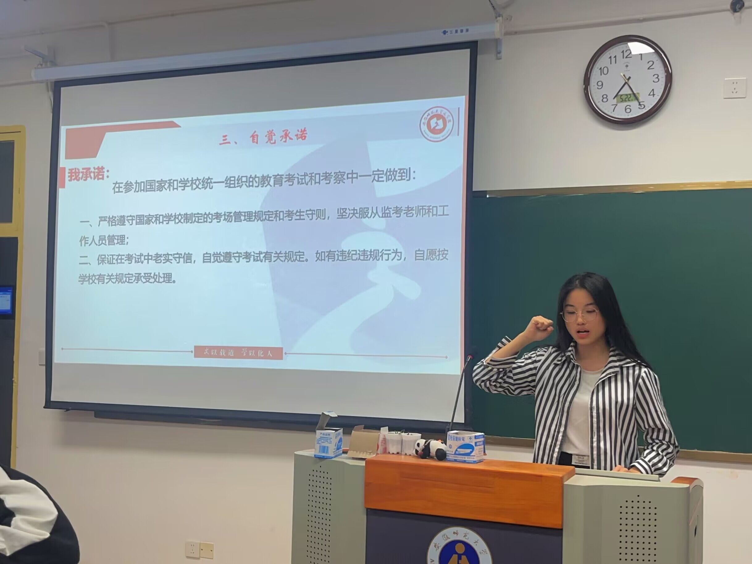 六月考试月来临之际,辅导员尚鹏老师针对诚信考试做出教育与指导。首先,尚鹏老师为同学们讲解诚信考试的内涵,再举出大学生不诚信考试案例作为具体实例,为同学们加强警戒。最后,2班李友乐、3班吴亮靓带领全体同学做出承诺,在考试中遵守考试纪律与考生守则,诚实守信,自觉遵守学校规定。