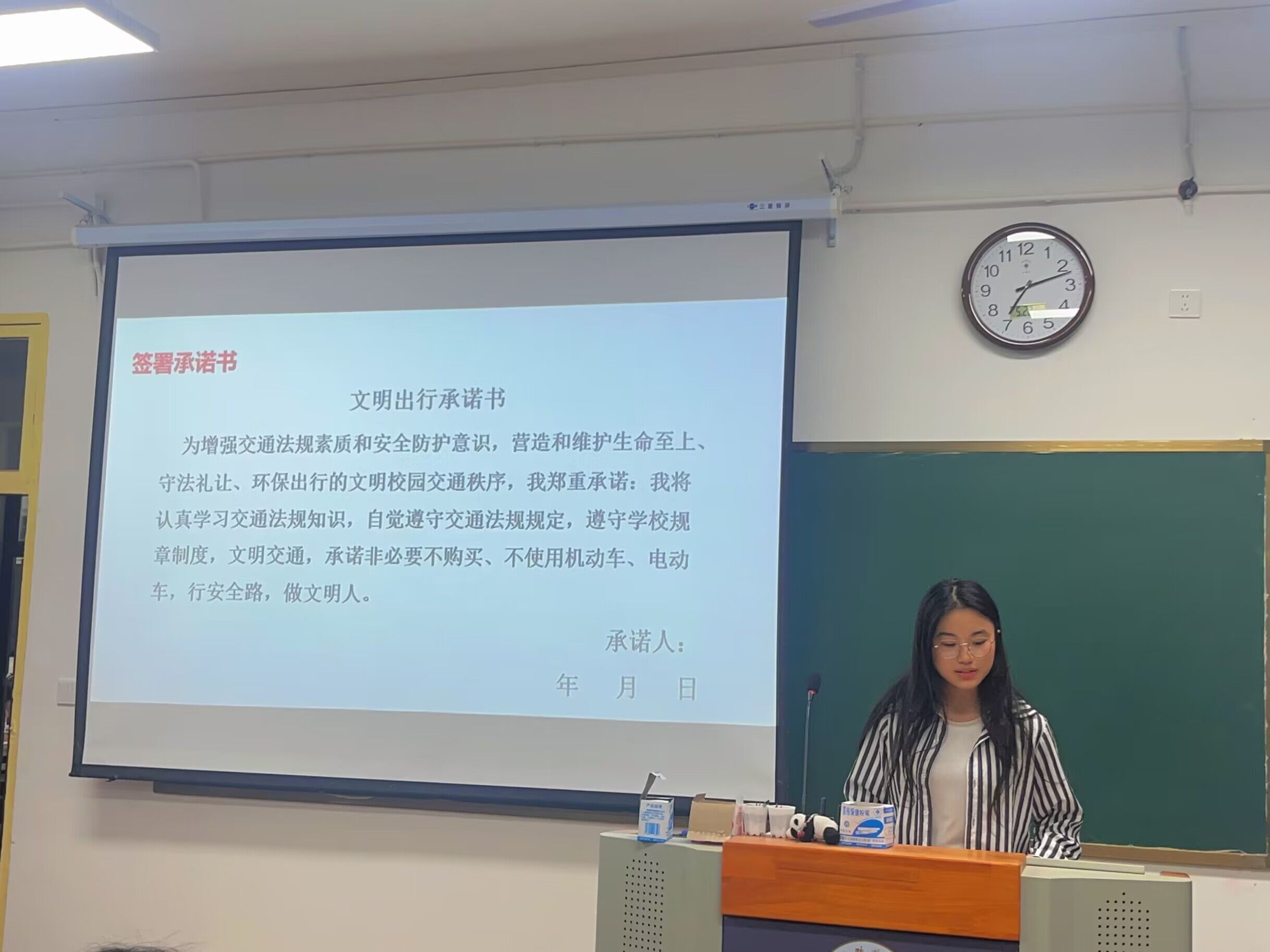 为增强同学们的交通法规素质与安全防护意识,班长吴亮靓带领同学们集体诵读文明出行承诺书,承诺认真学习交通法规知识,自觉遵守交通法规规定,遵守学校规章制度,共建校园文明交通,维护环保出行的文明校园交通秩序。