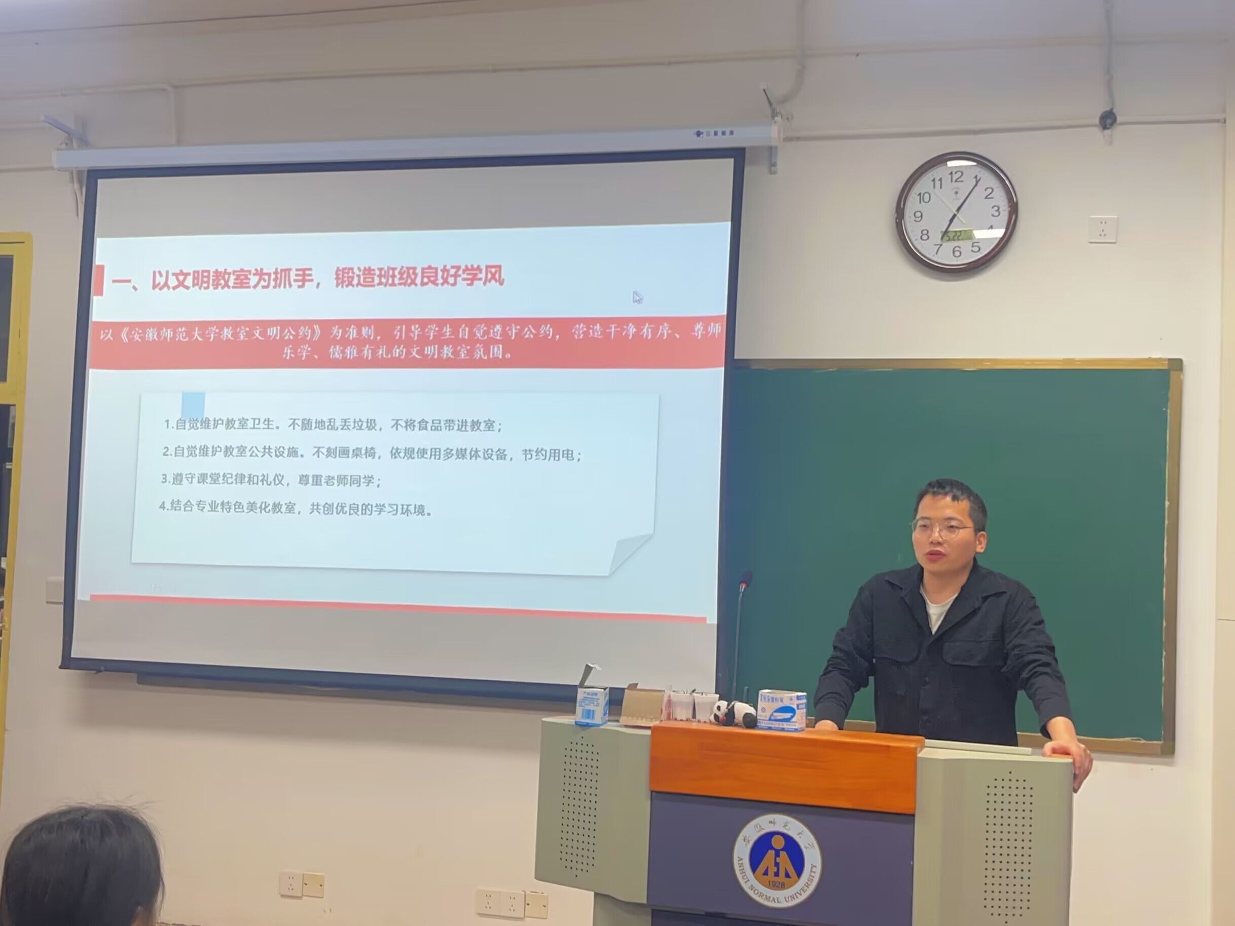 尚鹏老师分别从文明教室、文明就餐、文明交通、文明交往与文明上网多方面展开讲述,要以文明教室为抓手,锻造班级良好学风;以文明就餐为基础,形成文明就餐氛围;以文明交通为保障,建设安全有序的校园;以文明交往为根本,规范日常行为习惯;以文明上网为重点,营造清朗网络空间。努力从各个方面树立文明意识,提高学生个人文明素养,建设和谐有序的安师大校园。