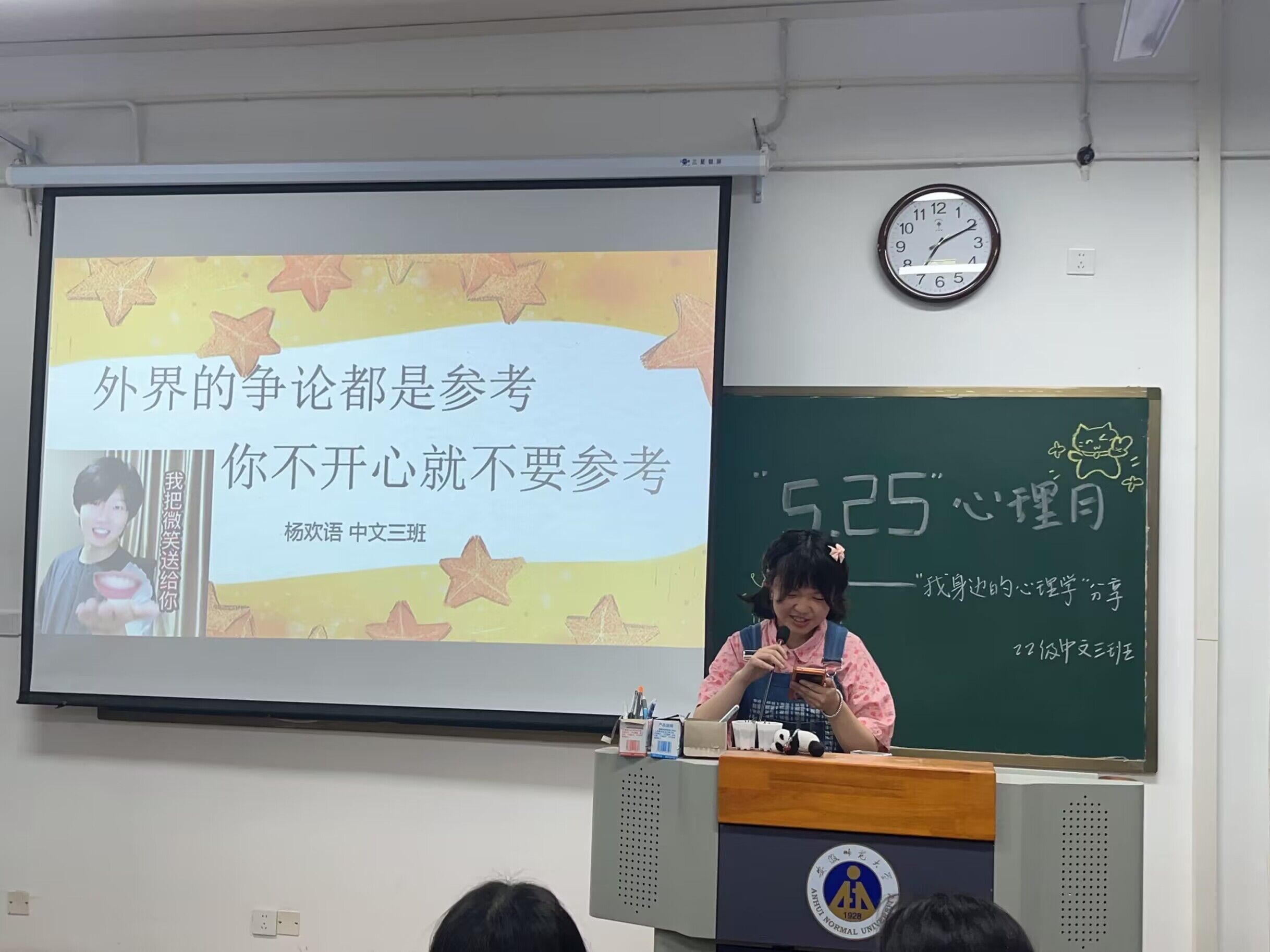 心理委员栾稼瑞讲解5.25心理健康日的内涵,关爱自我,了解自我,接纳自我,关注自我,提高自身心理素质,进而爱别人,爱社会。