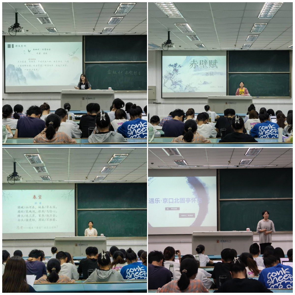 前期,经过各班级共20次初赛筛选,马欣月、雷天琴、李曜杉、陈欣然、简梦洁、黄卓嘉、曹吉吉、常馨悦、高思佳9名学生成功入围师范生示范课决赛,本次比赛包括“无生试讲”和“评委点评”两大部分,在考察选手们的教学设计,内容规划的同时,又注重师范生的教姿教态、语调起伏、板书设计等方面。各参赛选手试讲材料准备充分,从教材、学情、教学策略以及教学理念、教学过程等方面入手,充分利用多种富有创新性的手段方法如朗诵、乐曲导入等进行教学,在全面且深刻授课的同时,呈现了精彩多样、各具特色的教学活动:说理与实践相结合的《劝学》、忧国忧民沉郁顿挫的《春望》、怀古伤今悲壮豪迈的《念奴娇·赤壁怀古》、荡气回肠空灵悲伤的《赤壁赋》、感人肺腑赤胆忠心的《茅屋为秋风所破歌》、沉重悲愤的《永遇乐·京口北固亭怀古》、哀婉寥落的《声声慢》、浪漫优美的《再别康桥》.参赛选手的文本选择从诗词歌赋到文言散文,借助PPT和板书两种教学辅助,模拟与学生积极的互动,教学过程设计合理,教学方法新颖独特,试讲展示精彩纷呈。