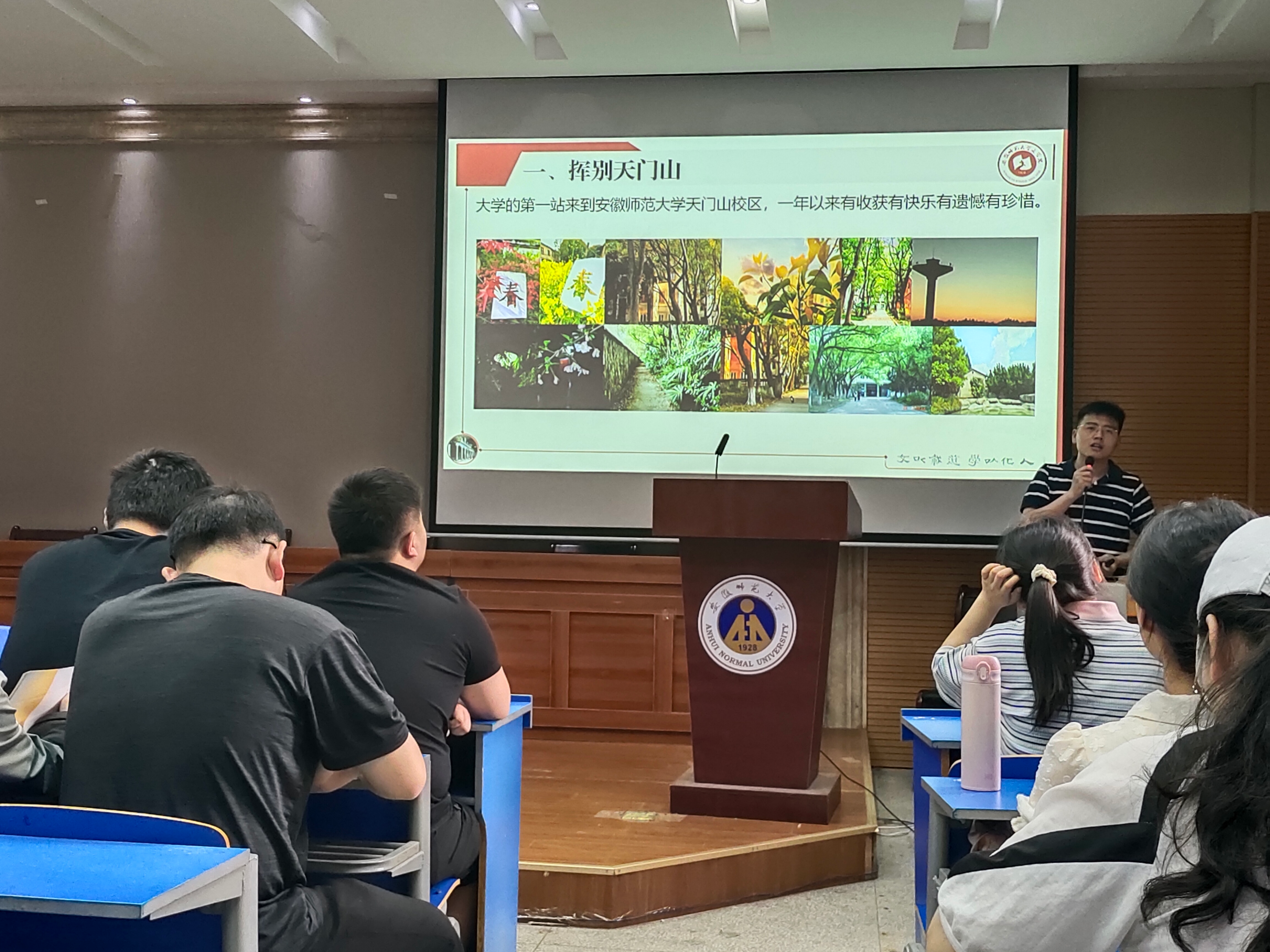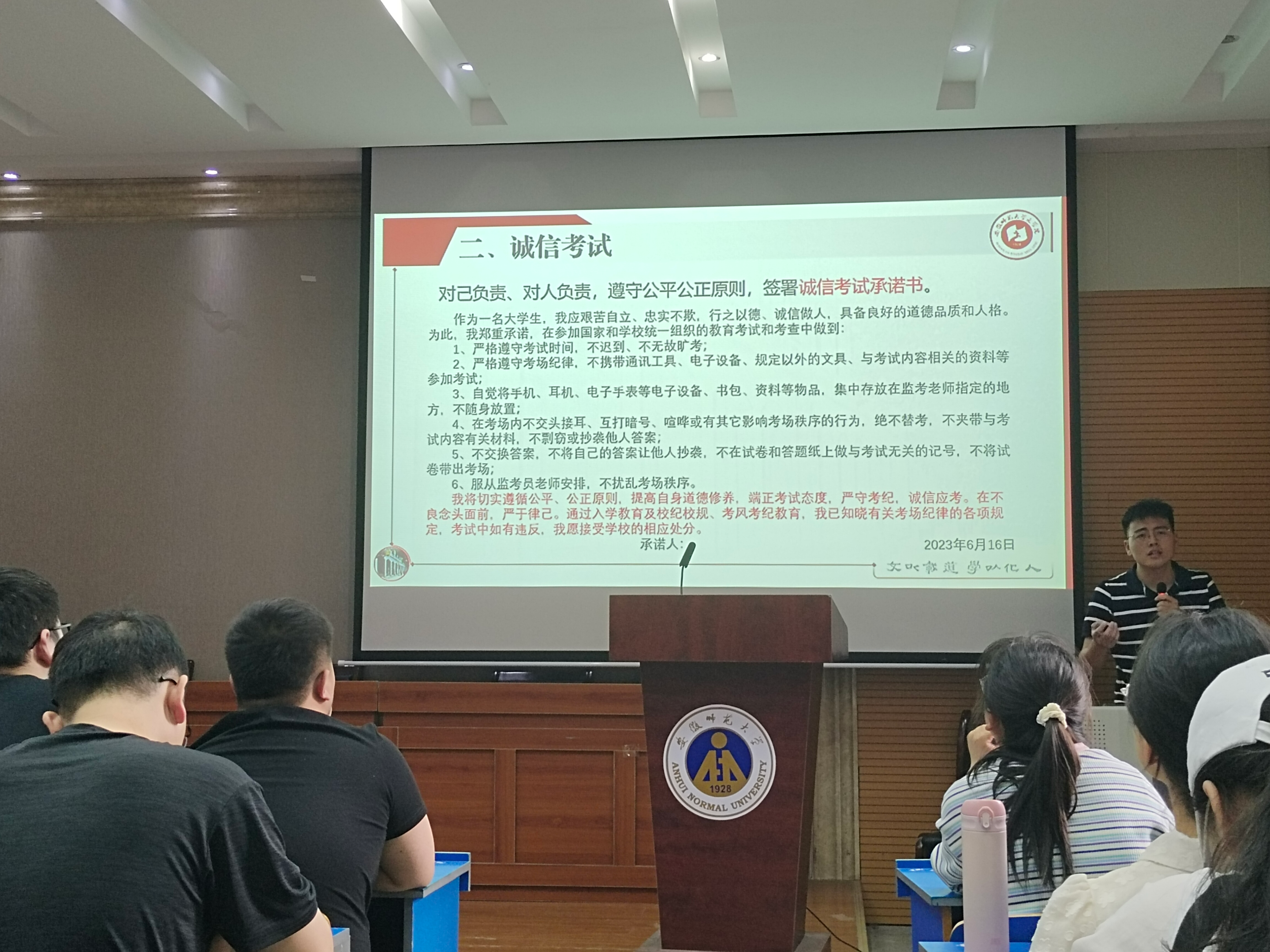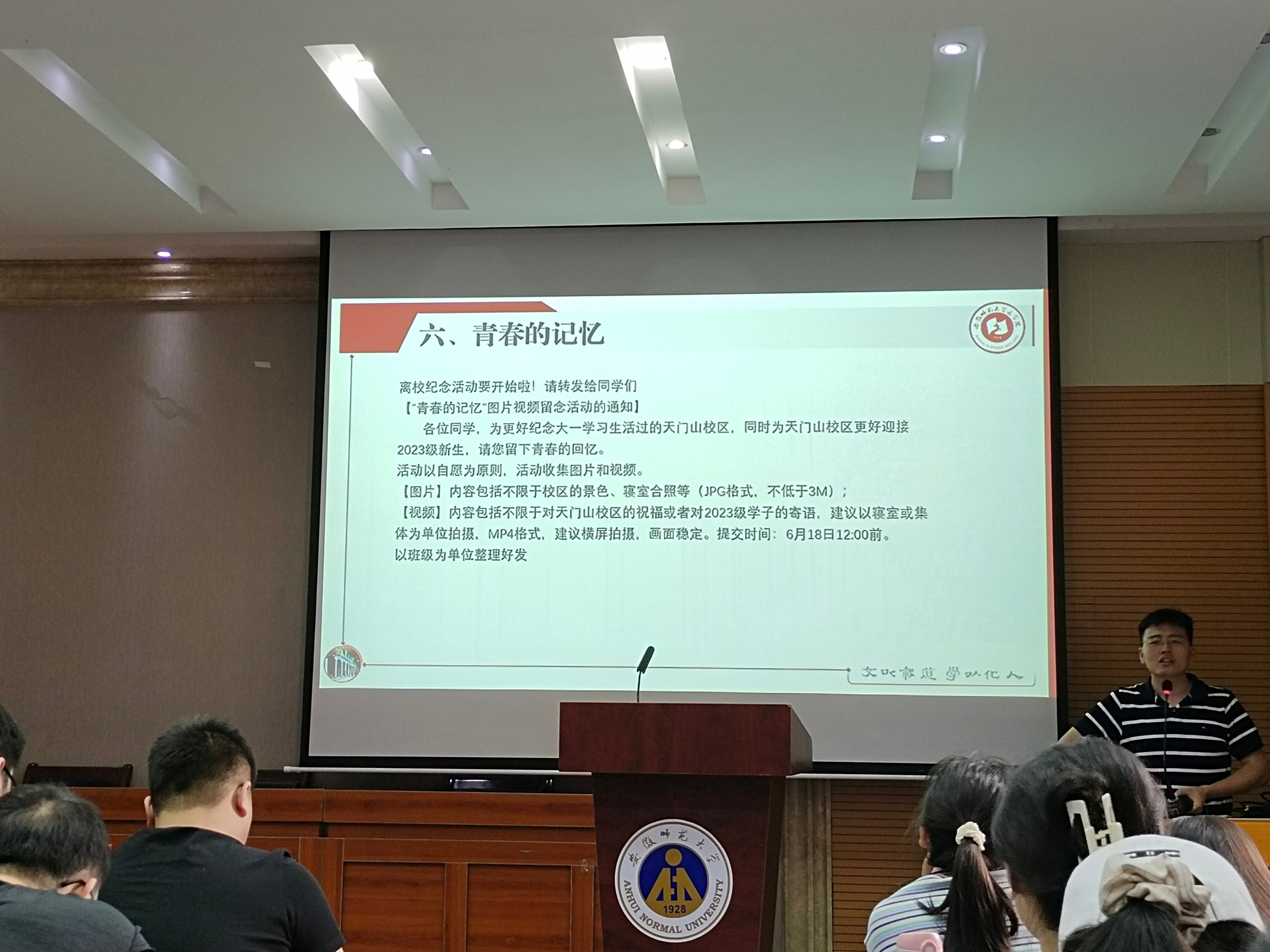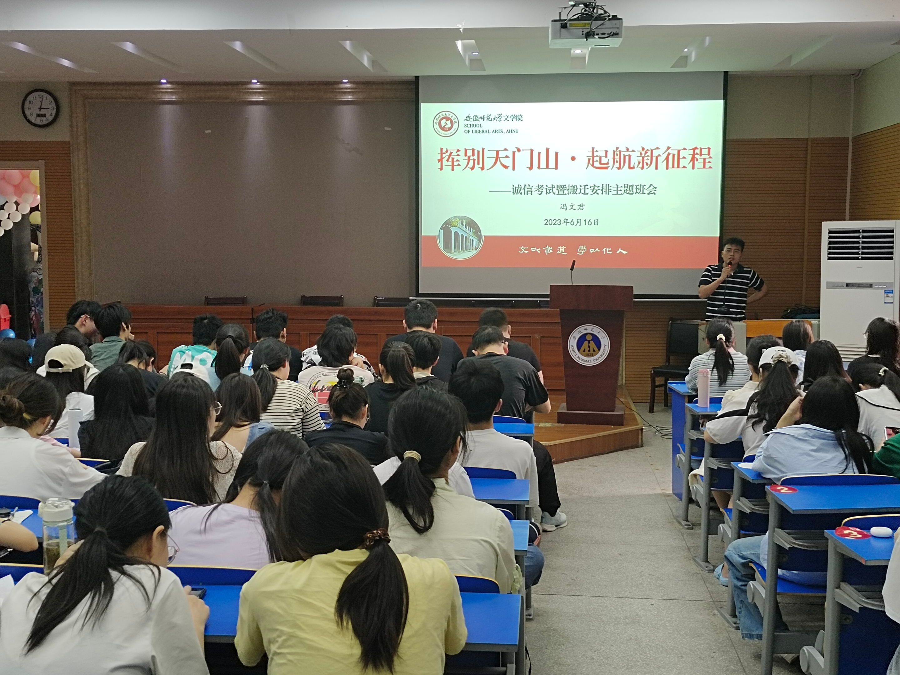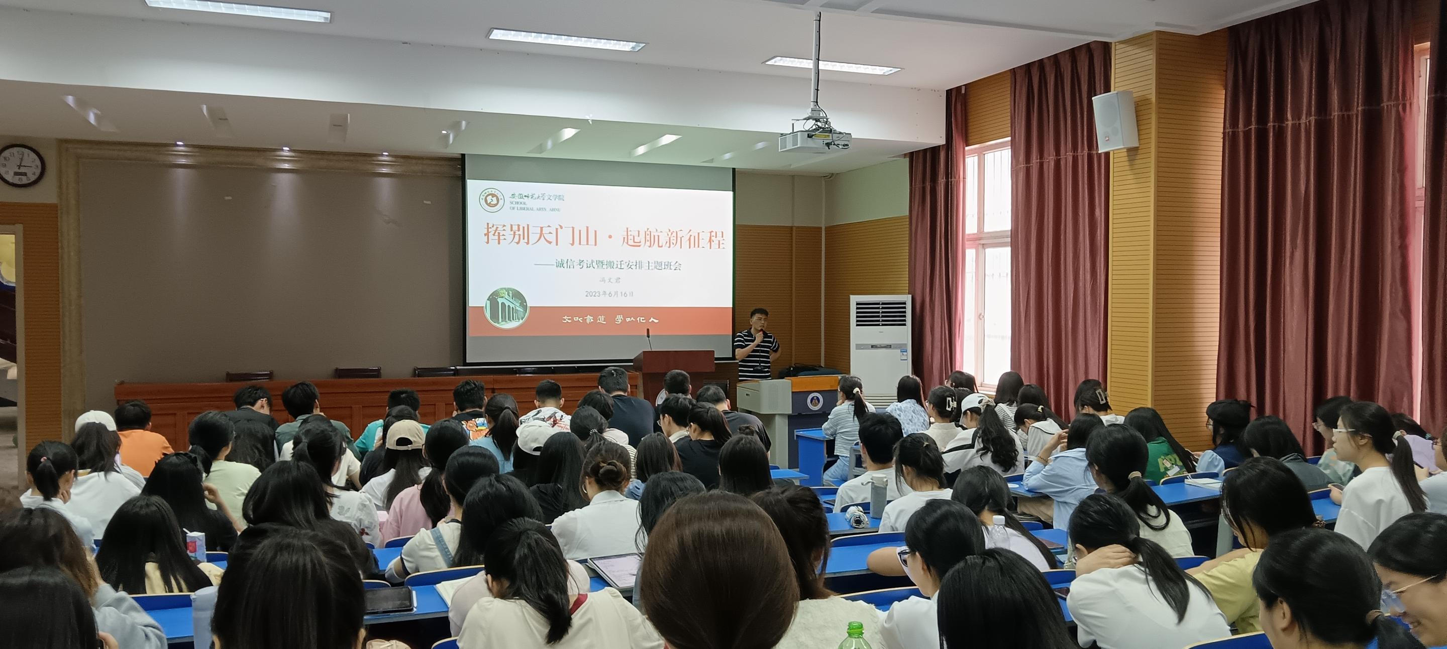 汉语言文学(师范)专业于2023年6月16日在图书馆报告厅展开了“挥别天门山,起航新征程”——诚信考试暨搬迁安排主题班会,此次班会由辅导员冯文君主持召开,专业全体同学参与。