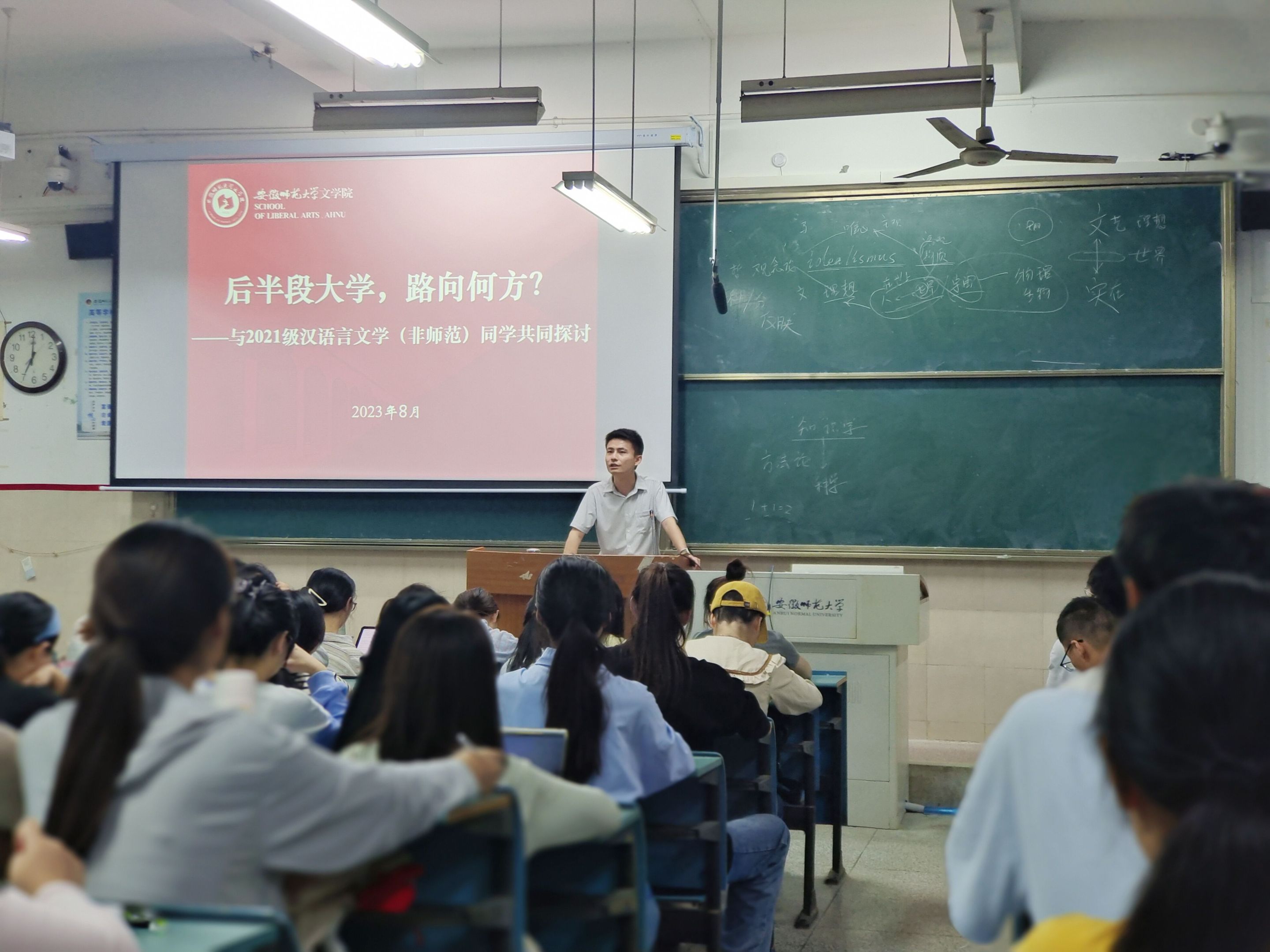 本网讯(文/朱浩然 阮异凡 图/朱浩然 阮异凡)伴随着金秋九月的到来,开学跫音踏响。经过暑期的休整,21级汉语言文学(非师范)1班、2班全体同学在校园重聚,踏上新的征途。为指导同学们在新的大三学年做好规划、明确奋斗目标,辅导员阮熹晟老师组织专业全体同学于2023年8月31日晚,在行知楼2050204教室开展了“开学第一课”主题班会。