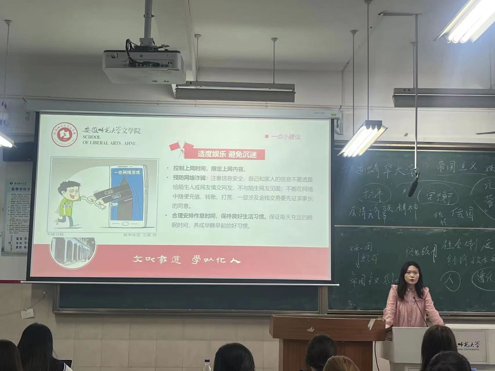 本次会议由辅导员唐宇晴老师主持,唐老师指出本次中秋国庆假期共八天,自9月29日至10月6日放假调休,10月7日、10月8日分别上10月5日、10月6日的课程,提醒同学们注意假期的起止时间,及时安排离返校行程。随后,唐老师从交通安全、饮食安全、消防安全、社交安全以及防范电信诈骗等方面向同学们着重强调了假期居家和留校的安全注意事项,通过列举各类真实案例,提醒同学们切莫掉以轻心,长鸣安全警钟。对假期有出游计划的同学,唐老师特别叮嘱同学们要注意外出住宿安全、游览景观安全、公共事件安全等,维护公共秩序,爱惜公共环境,做文明师大人。