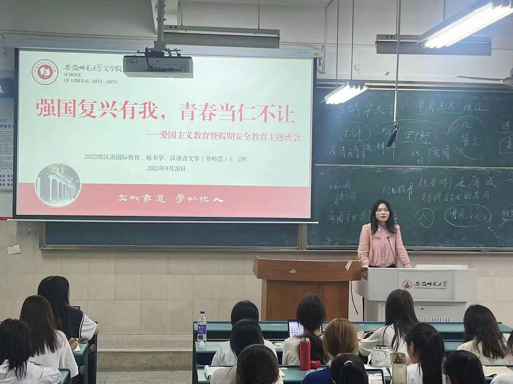 月圆人安乐,国泰民安康。为加强假期安全教育管理工作,增强学生安全意识,9月26日下午,2022级汉语言文学(非师范)、汉语国际教育、秘书学专业在行知楼2050204教室召开爱国主义教育暨国庆假期安全教育主题班会,全体同学参会。
