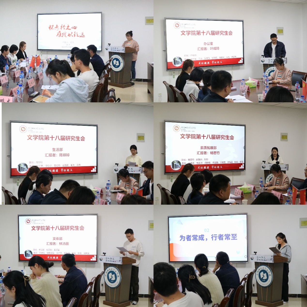 述职亮答卷,总结促成长。第十八届文研会主席团成员程石、叶成琦、陈婷婷以及各部门负责人依次进行述职报告。文研会主席程石对本年度第二学期文研会举办的活动进行总体回顾,从专业技能、艺体素养、统筹创新三个方面对研会工作取得的成果表示肯定。随后,各部门负责人围绕部门建设、常规工作、活动开展、问题反思、改进措施这五个方面进行工作汇报,介绍第二学期部门工作整体情况,明确部门职责,提出加强合作联动,不断反思总结,以更加积极主动的姿态为学院同学服务,为学院发展贡献力量。