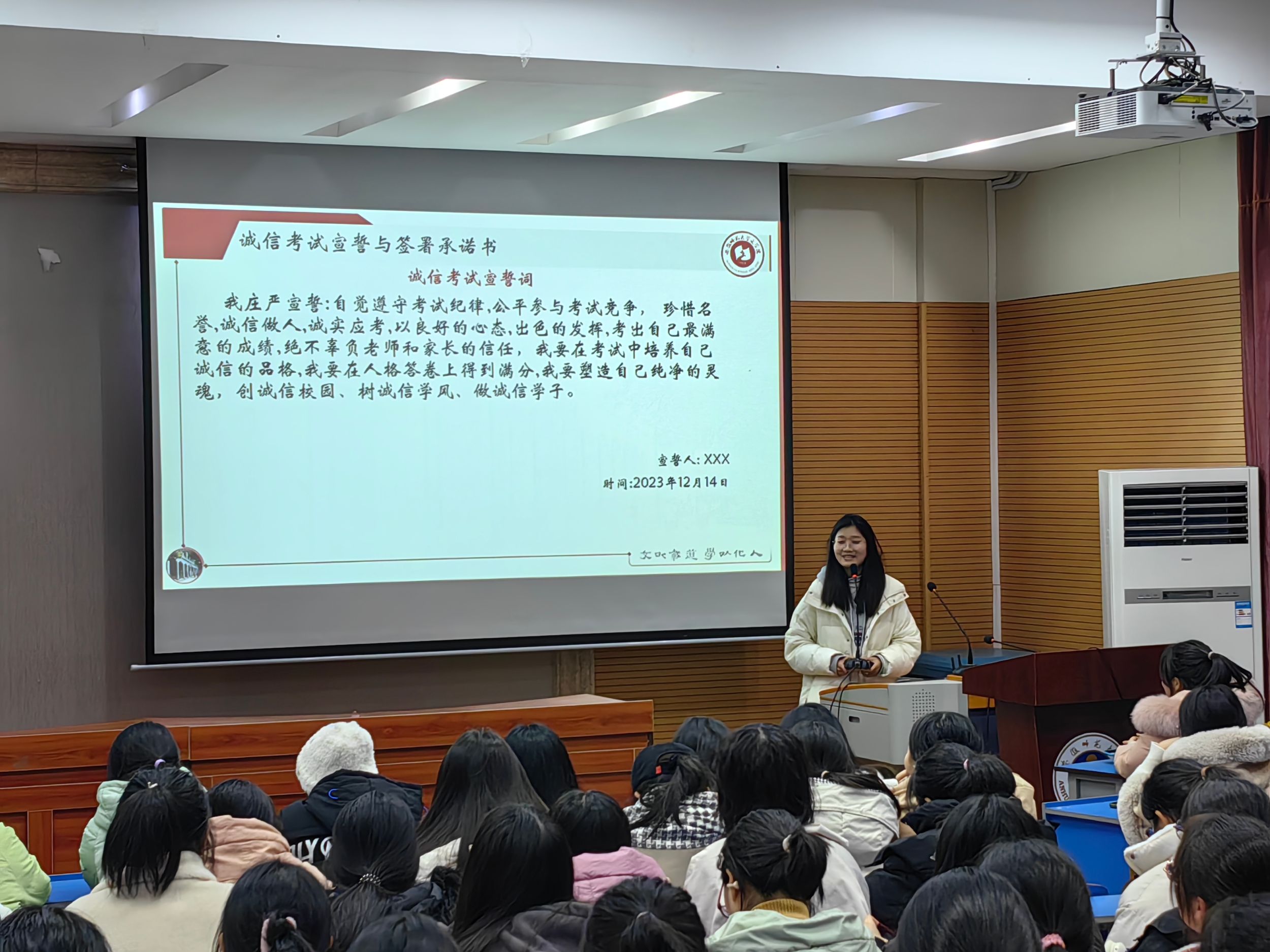 活动伊始,胡慧老师一开始向同学们指出未来两周将迎来考试周,希望同学们提前做好准备,认真复习备考。随之向同学们强调诚信考试的重要性,坚决杜绝考试作弊情况的发生。再向同学们说明考试作弊带来的严惩规定与危害,考试作弊一经发现将会记入个人档案伴随一生。紧接着对同学们近期表现出礼貌问题、独立问题、请假问题和反馈机制问题,向同学们做了强调和要求。最后,由李馨同学带领同学们一起宣读诚信考试宣誓词,同学们的声音铿锵有力,体现着对诚信考试的坚定信心。