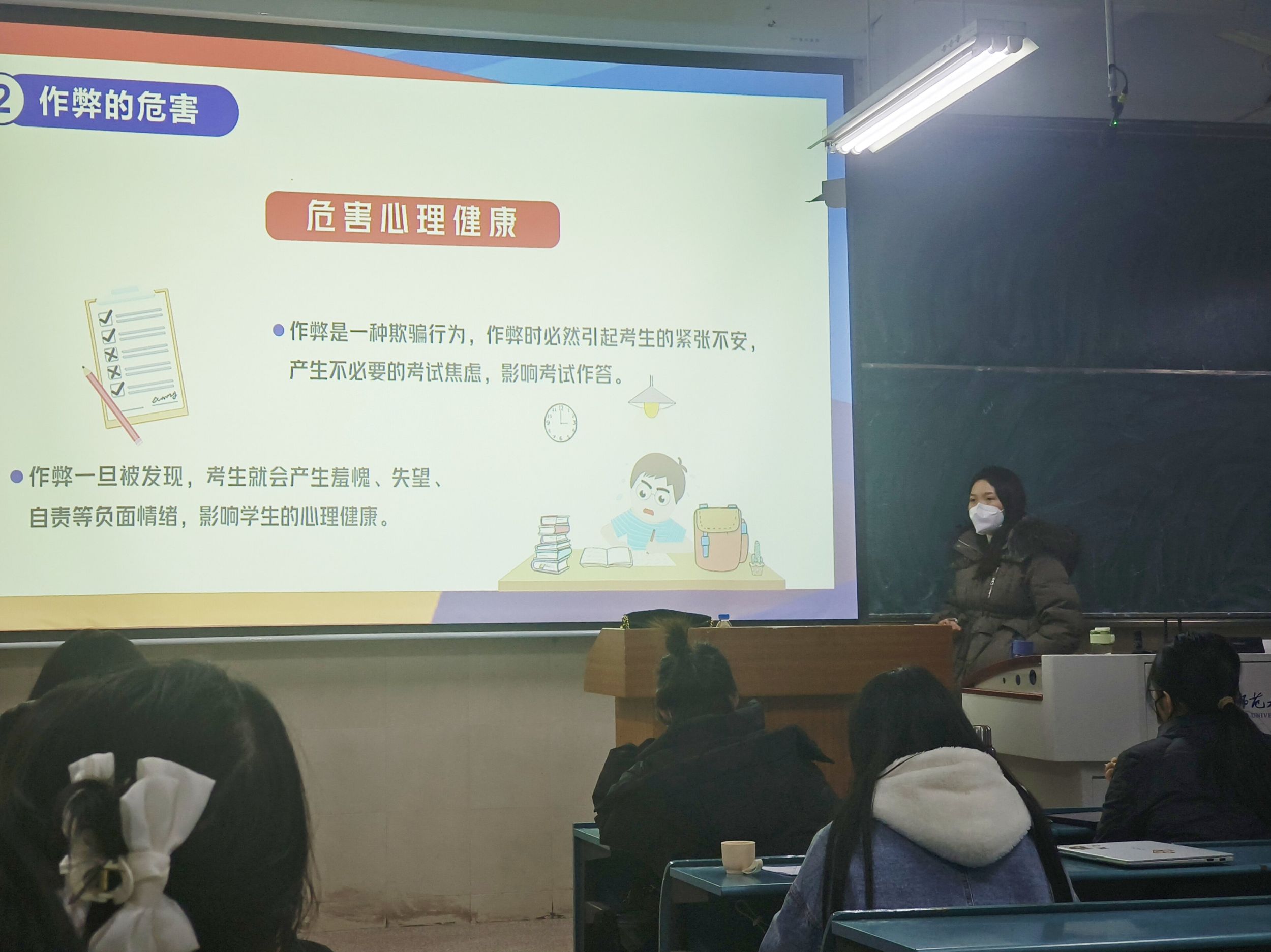 班会上,唐宇晴围绕考试的意义、考试作弊现象以及考试作弊危害等向同学们强调诚信应考的重要性;通过生动真实事例,警示同学们切勿在考试中出现依赖心理、虚荣心理、投机心理、冒险心理、讲义气心理等,要坚信功在平时,合理做好期末复习计划,端正学习态度,静心复习备考,考出理想成绩。围绕《必赢线路检测3003普通全日制本科生考试管理办法(修订)》内容,唐老师重点解读了考场违纪及考试作弊的相应处分条例,提倡大家弘扬“诚信考试光荣,违纪舞弊可耻”的风尚,抛弃侥幸心理,坚守底线,诚信应考。