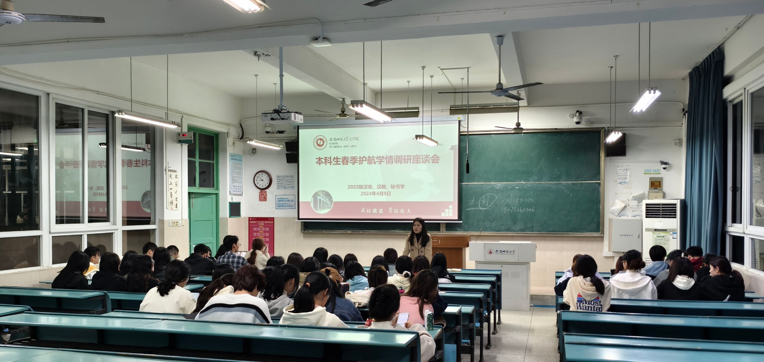 本网讯(22汉非孔瑶 )为进一步落实大学生护航行动计划,及时了解并掌握新学期学生在思想、学习、生活等方面存在的实际问题。4月9日晚,2022级汉语言文学(非师范)、汉语国际教育、秘书学专业在2050104教室开展了新学期学情调研座谈会。本次座谈会由辅导员唐宇晴主持,全体班委参会。