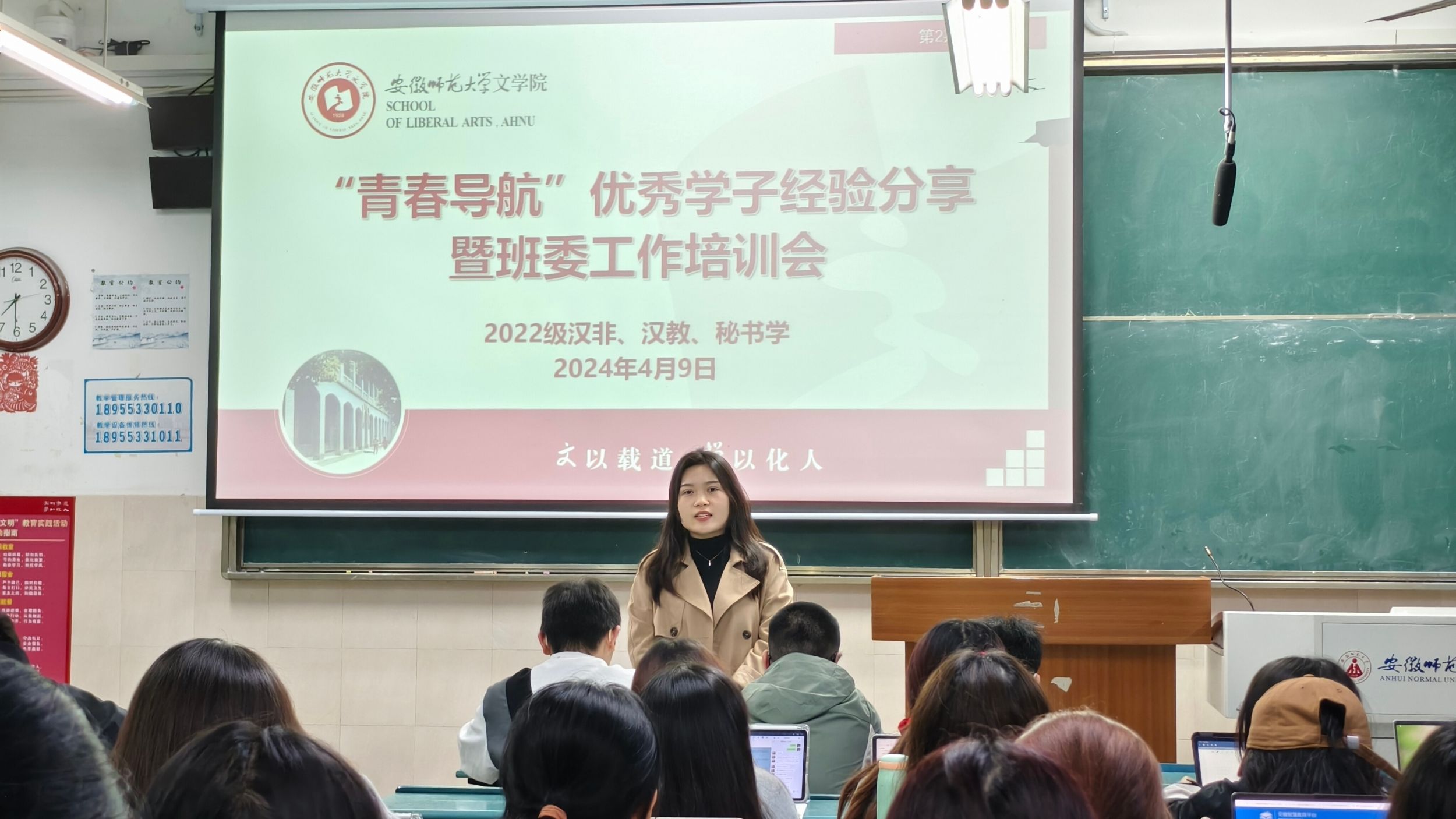 本网讯(文/孔瑶 图/孙梦阳)为充分发挥优秀学子的朋辈引领作用,提升班委工作的组织力、战斗力,加强班团建设的凝聚力,4月9日晚,2022级汉语言文学(非师范)、汉语国际教育、秘书学专业在行知楼2050104教室开展了“青春导航”优秀学子经验分享暨班委工作培训会。本次会议由唐宇晴老师主持,全体班委成员参加,大家齐聚一堂,共同交流学习心得,分享工作经验。