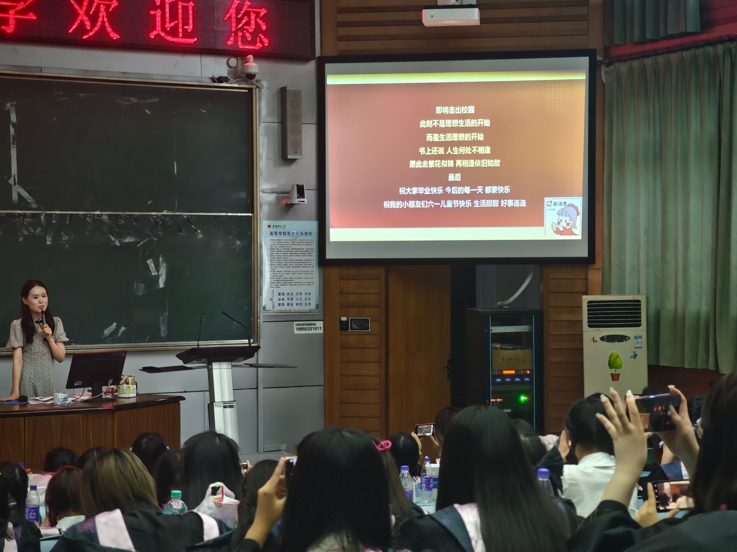 最后杨玉婷老师与同学们一同深情回顾了四年大学时光,包括专业知识上的积累与领悟、校园文化活动中的奉献和投入、以及社会实践中的成长与蜕变。她肯定了同学们四年以来的成长和进步,并对未来表达了美好的祝愿:“此刻不是理想生活的开始,而是生活理想的开始。人生何处不相逢,愿此去繁花似锦,再相逢依旧如故。”她的话语饱含了对同学们的憧憬与关爱,宛如一束温暖的初夏阳光,轻轻拂过心间,带来了慰藉和鼓舞。最后,六一儿童节将至,老师还为同学们准备了棒棒糖,希望同学们未来的日子,生活甜甜好事连连,眼泪与笑声,同学们纷纷走至台前,合影留念。