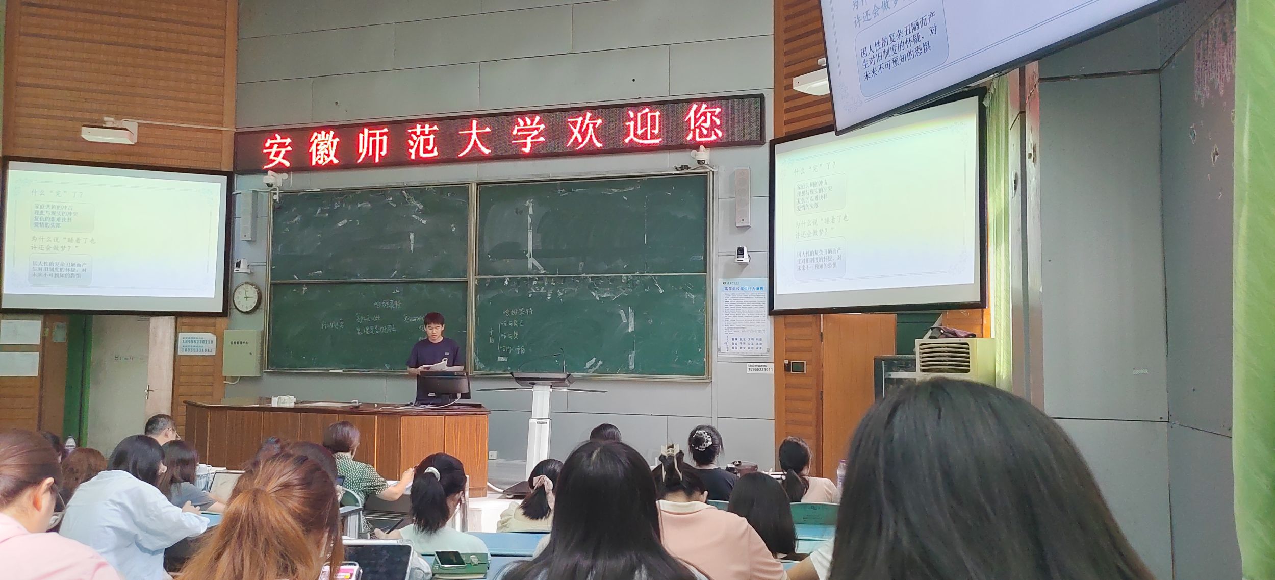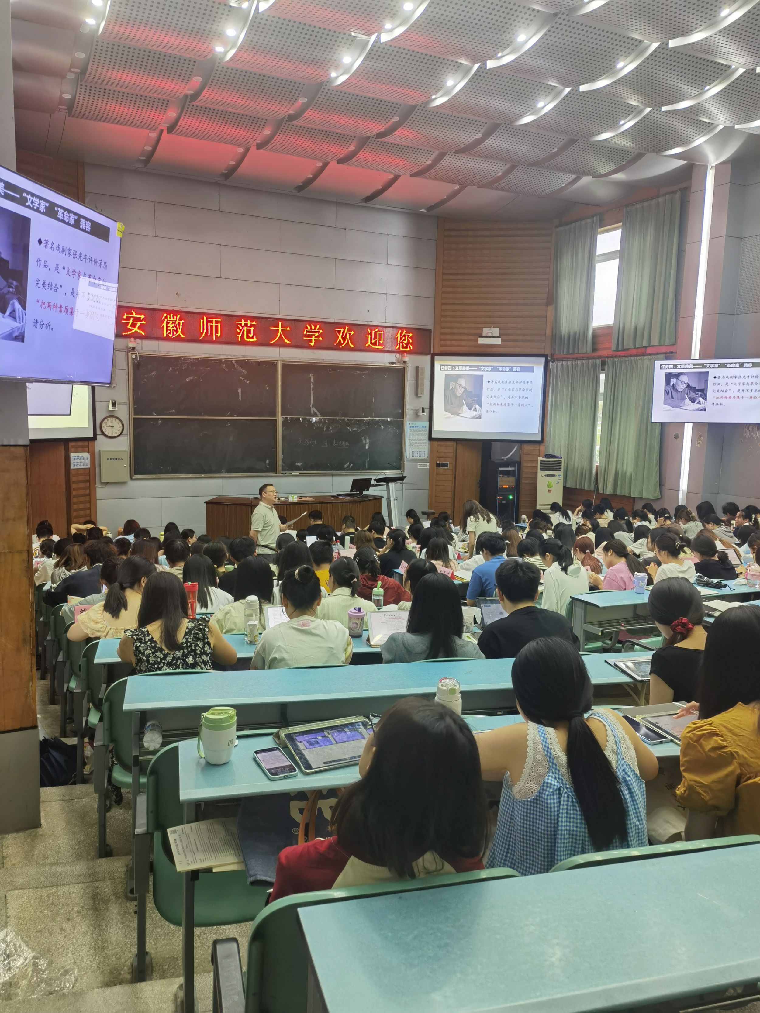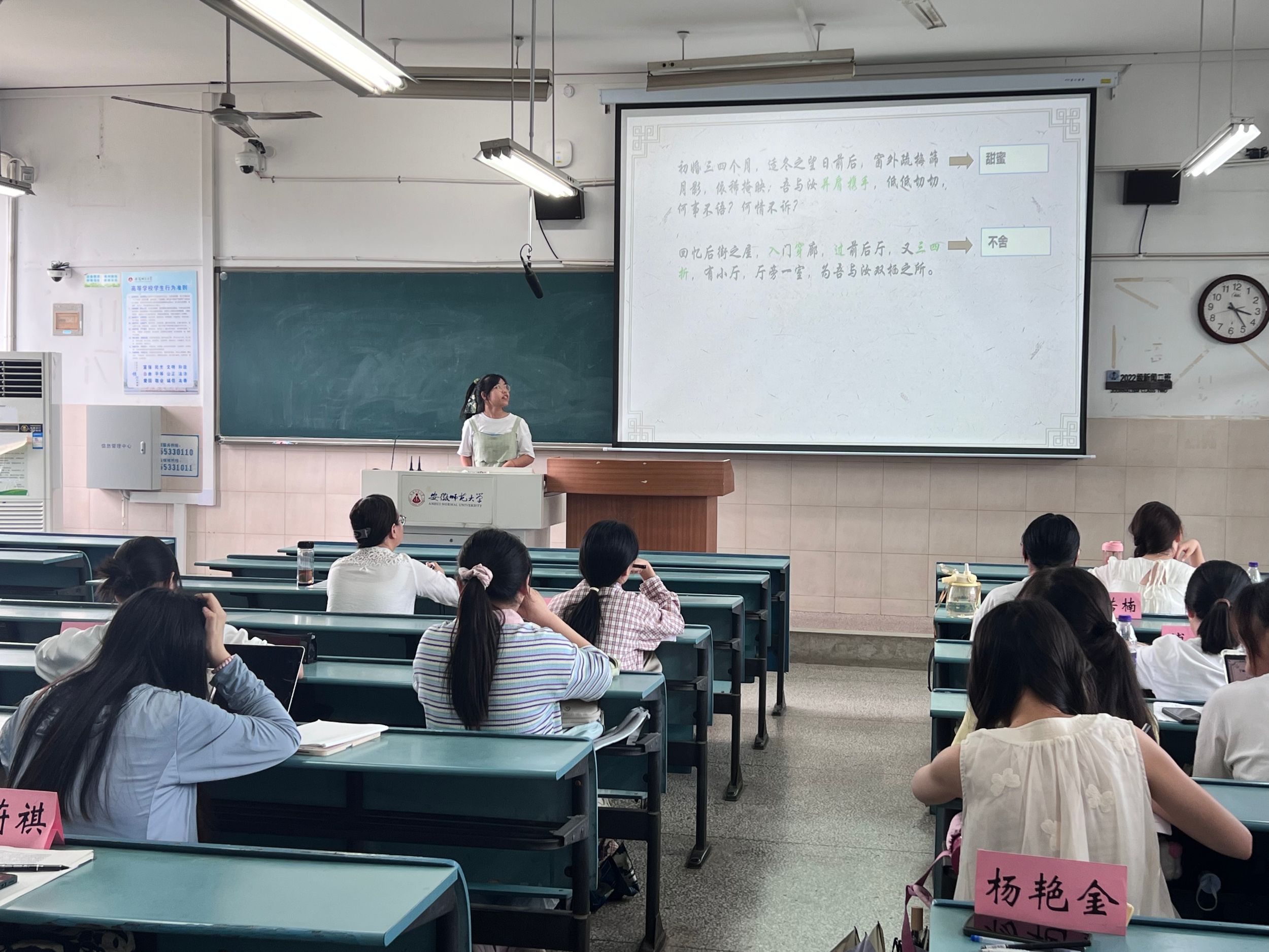第一周由合肥市第一中学正高级教师程丽华和高级教师汪梅林以及必赢线路检测3003附属中学高级教师候远军给同学们授课。同学们带着饱满的热情,积极参与到课堂中,与中学一线名师进行面对面的交流。同学们不仅在课堂上深入学习了语文基础知识,更通过一系列丰富多样的实践活动,提升了教育教学实践能力。在两位老师的课堂中,同学们仿佛亲身置身于19世纪沙皇统治下的俄国社会环境之中,亲眼目睹了别里科夫那件标志性的“套子”;仿佛插上想象的翅膀,一步步地走进了林教头风雪山神庙的场景中,体验林冲在山神庙中孤独、绝望又坚定的情绪;仿佛走进笔下,茹志鹃来到一个充满诗意与哲理的世界,感受人性的光辉,对生命价值的尊重以及对理想的坚守;仿佛化身伟人毛泽东,独立湘江,抒发对革命、国家和人民的深刻思考和坚定信念……